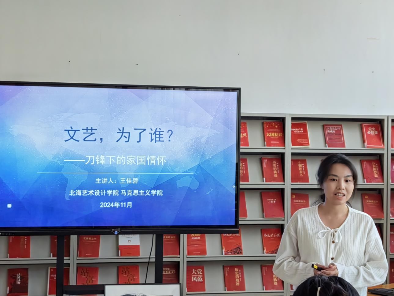 11月11日下午5:00,王佳碧老师在图书馆三楼“红色阅读角”举办红色知识专题讲座,本期讲座的主题是文艺,为了谁?——刀锋下的家国情怀!书法学院、服装学院、人文教育学院的积极分子到场聆听讲座并参与互动,氛围良好,同学们纷纷表示受益匪浅。(张家梅摄)