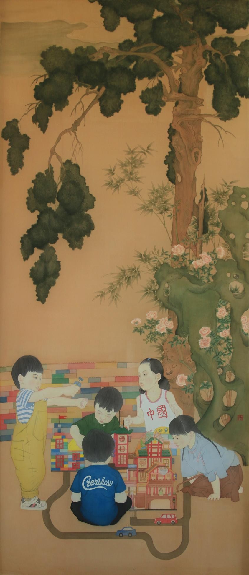 韦怡姗 《乐高戏婴图》 206cm*88.8cm 绢本设色 2024