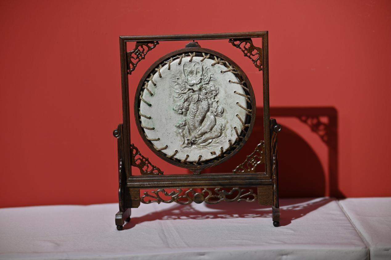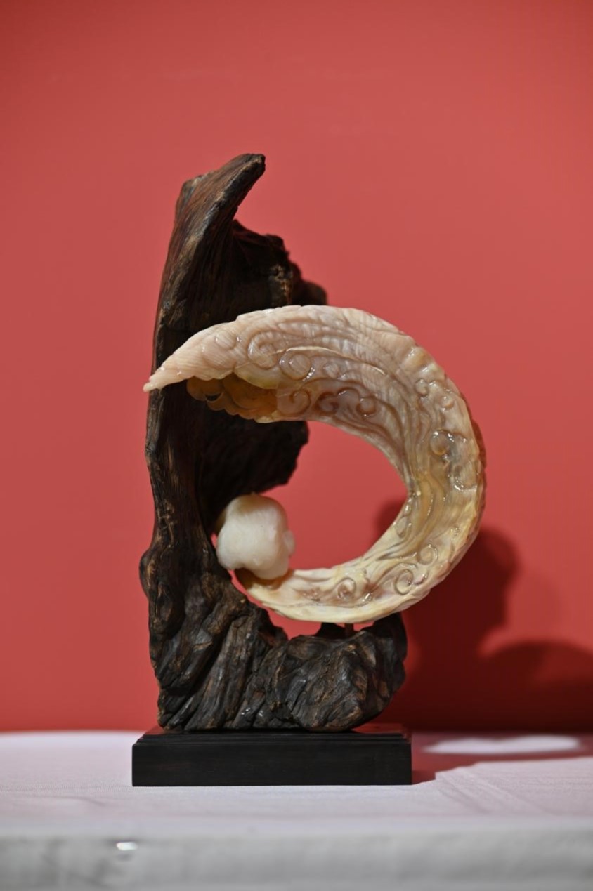 马润泽-《龙入云海》尺寸:50*35*15材质:盘羊角,新疆玉 指导教师:林雄、许珍珍