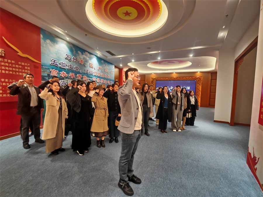 第一站参观了中共钦州历史陈列馆。陈列馆内丰富的史料与鲜活的展览生动呈现了钦州人民在中国共产党引领下波澜壮阔的革命斗争画卷。党员们专注聆听讲解员讲述,目光在每一件文物、每一张照片上停留,深刻体悟先辈们为民族独立和人民解放奋勇拼搏、舍生忘死的伟大精神,从中汲取前行力量。全体党员重温了入党誓词,铮铮誓言回荡在馆内,彰显着党员们不忘初心、牢记使命的坚定信念。