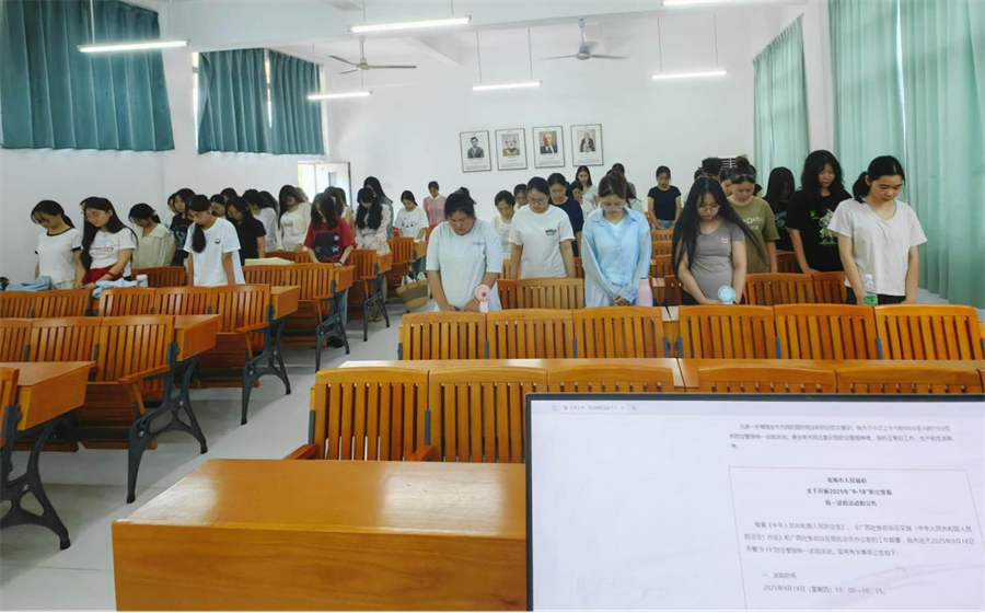 9月18日上午,当防空警报响彻校园,党员教师文春明在课堂上组织学生肃立默哀,缅怀先烈。默哀的三分钟里,教室鸦雀无声,学生挺直腰背、神情肃穆,对历史的敬畏与对先烈的缅怀在无声中传递。后续授课内容围绕“马克思主义新闻观”展开,文春明老师结合“九一八”与今年九三阅兵等思政元素,通过课件图文、视频展示及富有激情的语言深化教育,展现了一场生动的思政课堂,课程融入思政元素、实现思政教育与课堂场景自然结合。