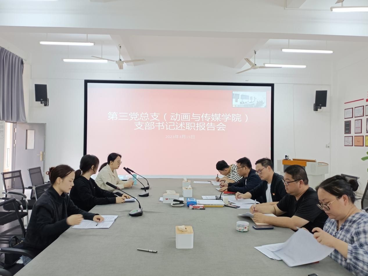 为深入贯彻党的二十大精神,进一步提升基层党支部战斗堡垒作用,总结工作经验,挖掘工作亮点,检验工作成效,正视工作不足,明确工作思路,推动学院党建工作高质量发展。根据校党委工作要求,2023年3月15日下午,中共北海艺术设计学院第三党总支(动画与传媒学院)委员会组织召开“第三党总支支部书记述职报告会”。本次会议由第三党总支书记庞定坤主持,全体总支委员、党支部书记共9人参会。