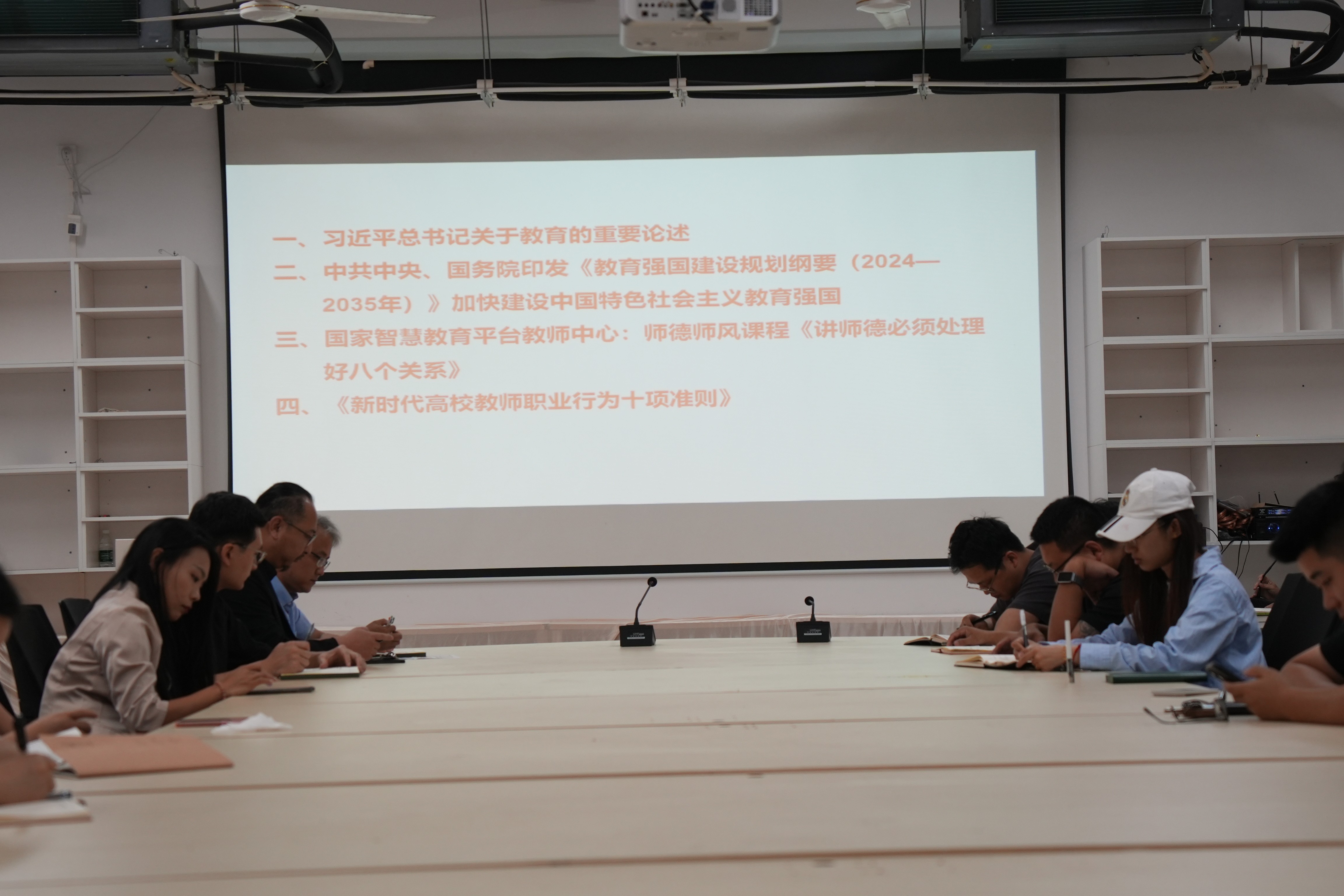 本次专题学习采用视频学习、专题研读等多种形式,组织全体教师系统学习核心内容、筑牢思想根基。庞定坤书记明确了四项核心学习任务,要求全体教师深学细悟、对标践行,切实将师德规范内化于心、外化于行。学习过程中,全体教师通过专题视频,集中学习习近平总书记关于教育的重要论述、《教育强国建设规划纲要(2024—2035年)》及《讲师德必须处理好八个关系》,深刻领会新时代教育的使命方向、战略布局与师德实践要义。同时,会议专题学习《新时代高校教师职业行为十项准则》,逐条解读准则内涵,进一步明确教师职业行为规范与师德底线要求,引导教师坚定政治方向、潜心教书育人、恪守职业操守、做到为人师表,助力教师牢记育人使命、坚守职业底线。