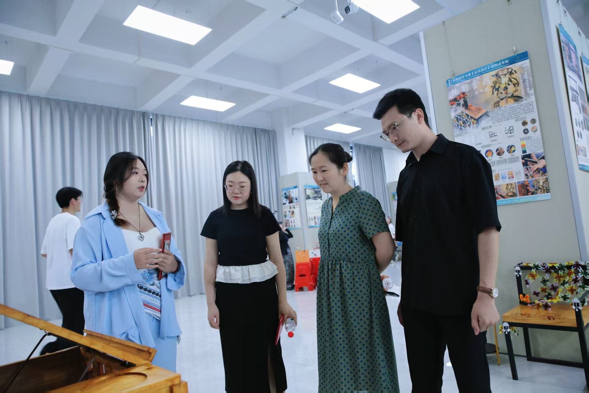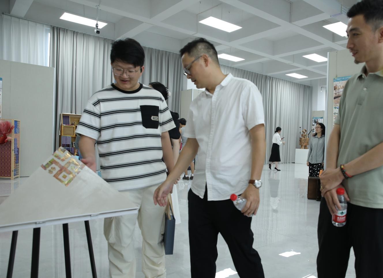 观展交流环节气氛活跃非凡。参展学生纷纷担任起“创意阐述者”的角色,凭借扎实的专业基础和自信的表达,系统介绍设计构思、工艺难点及蕴含的文化理念,清晰勾勒家具设计作品诞生的故事,全方位诠释其独特魅力。学生们同时保持着开放的学习态度,积极倾听并记录领导、嘉宾与专业教师的点评意见。现场深度互动频繁,思想的火花在交流中迸发,为此次成果展注入了浓厚的学术探讨氛围与互动深度。