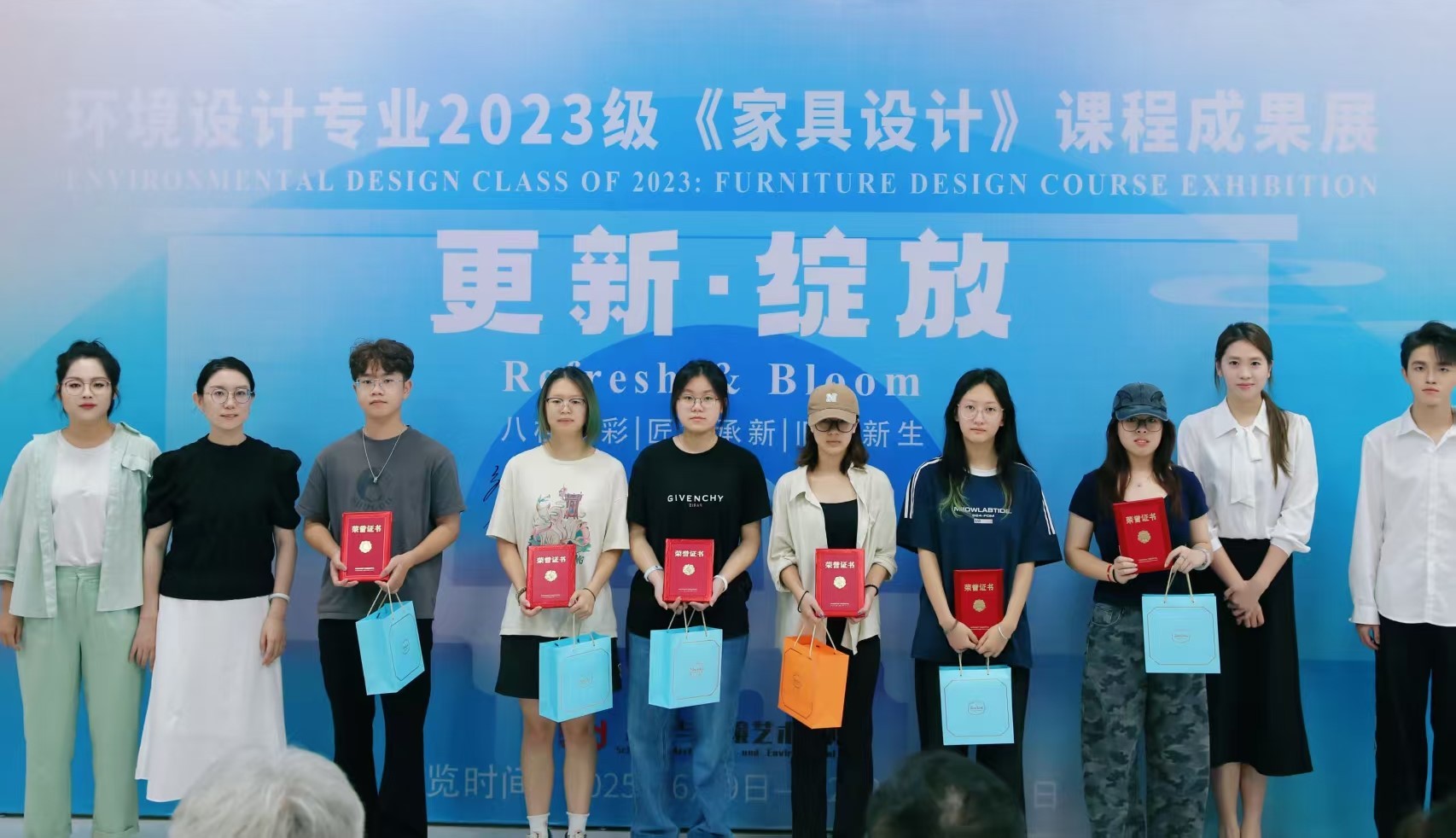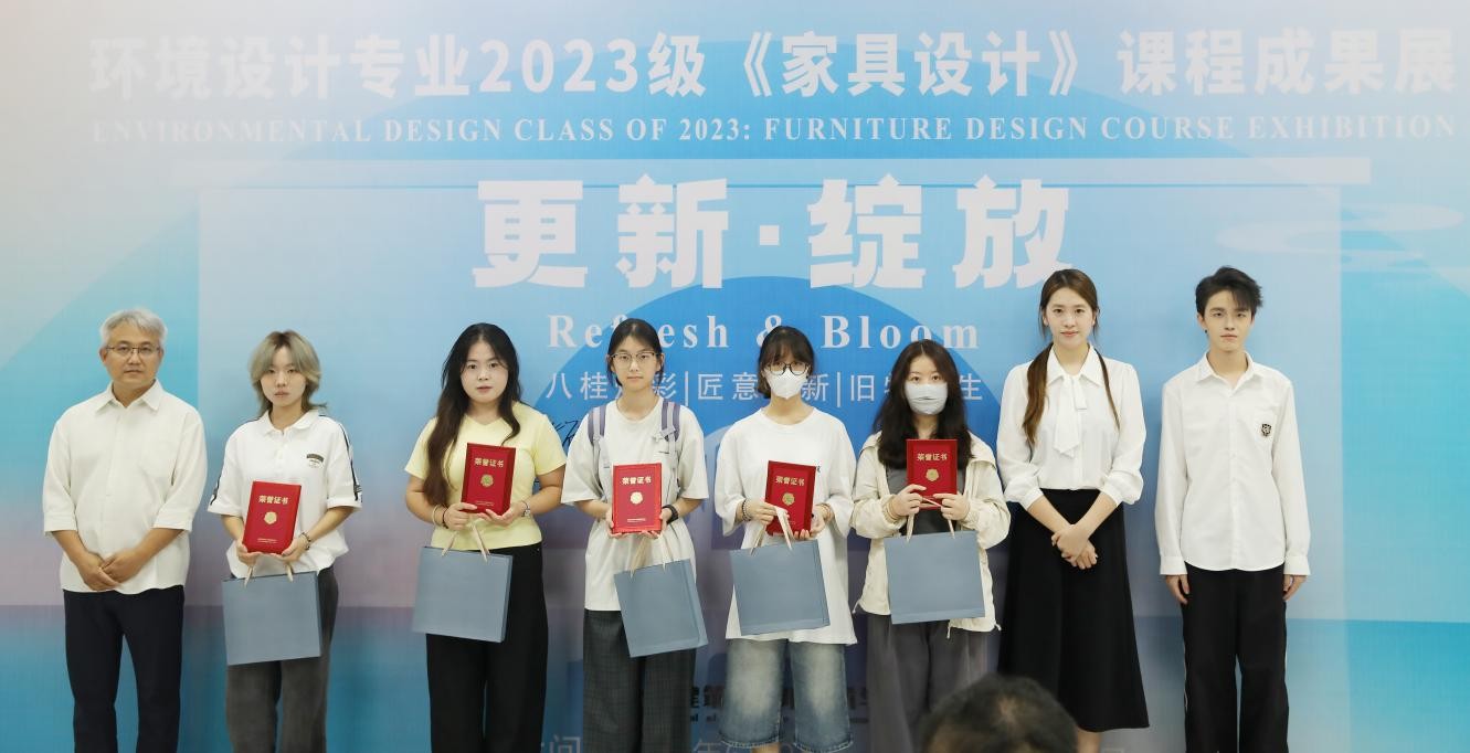 此次展览通过主题的表达、广西地域文化与传统非遗技艺的结合、家具的多功能等方面进行综合考量,评测出优秀奖35项,三等奖20项,二等奖10项和一等奖5项。课程组为等级奖项获奖同学制作了精美的奖品和证书。在充满激情和热烈的氛围中,出席领导、嘉宾现场为获奖学生颁发了荣誉证书。