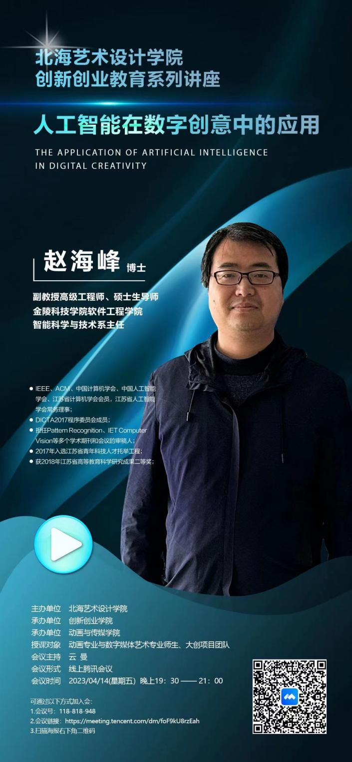 为持续深化创新创业教育改革,营造我校浓厚的创新创业校园文化氛围,近日,金陵科技学院软件工程学院智能科学与技术系主任赵海峰博士应邀为我校开展题为“人工智能在数字创意中的应用”的线上讲座。讲座由我校创新创业学院院长云曼主持。