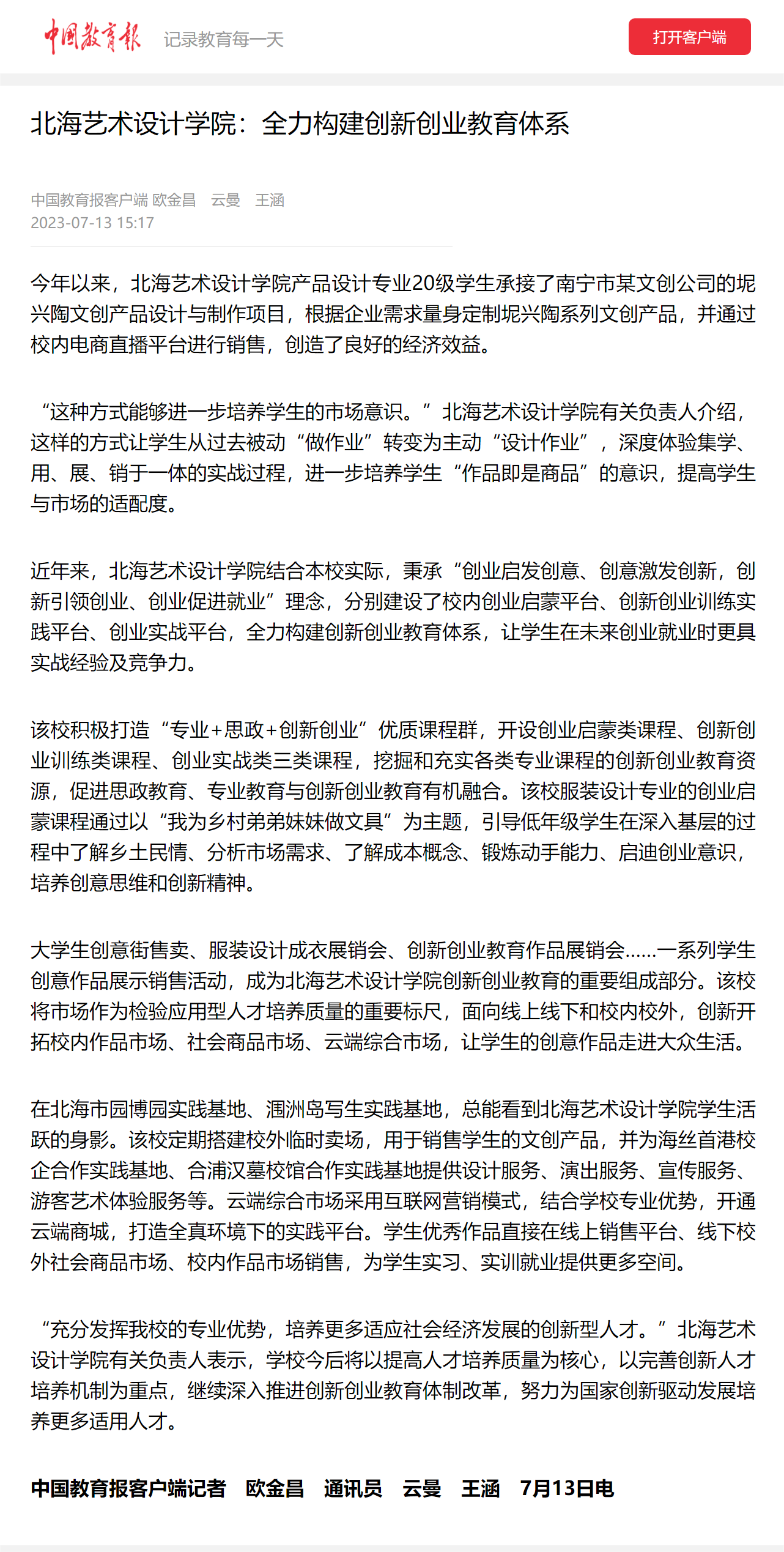 中国教育报:北海艺术设计学院全力构建创新创业教育体系
