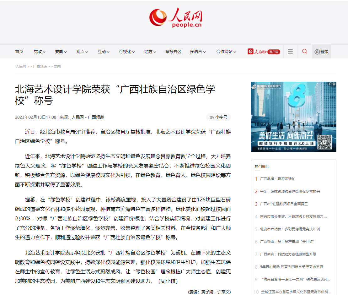 人民网:北海艺术设计学院荣获“广西壮族自治区绿色学校”称号