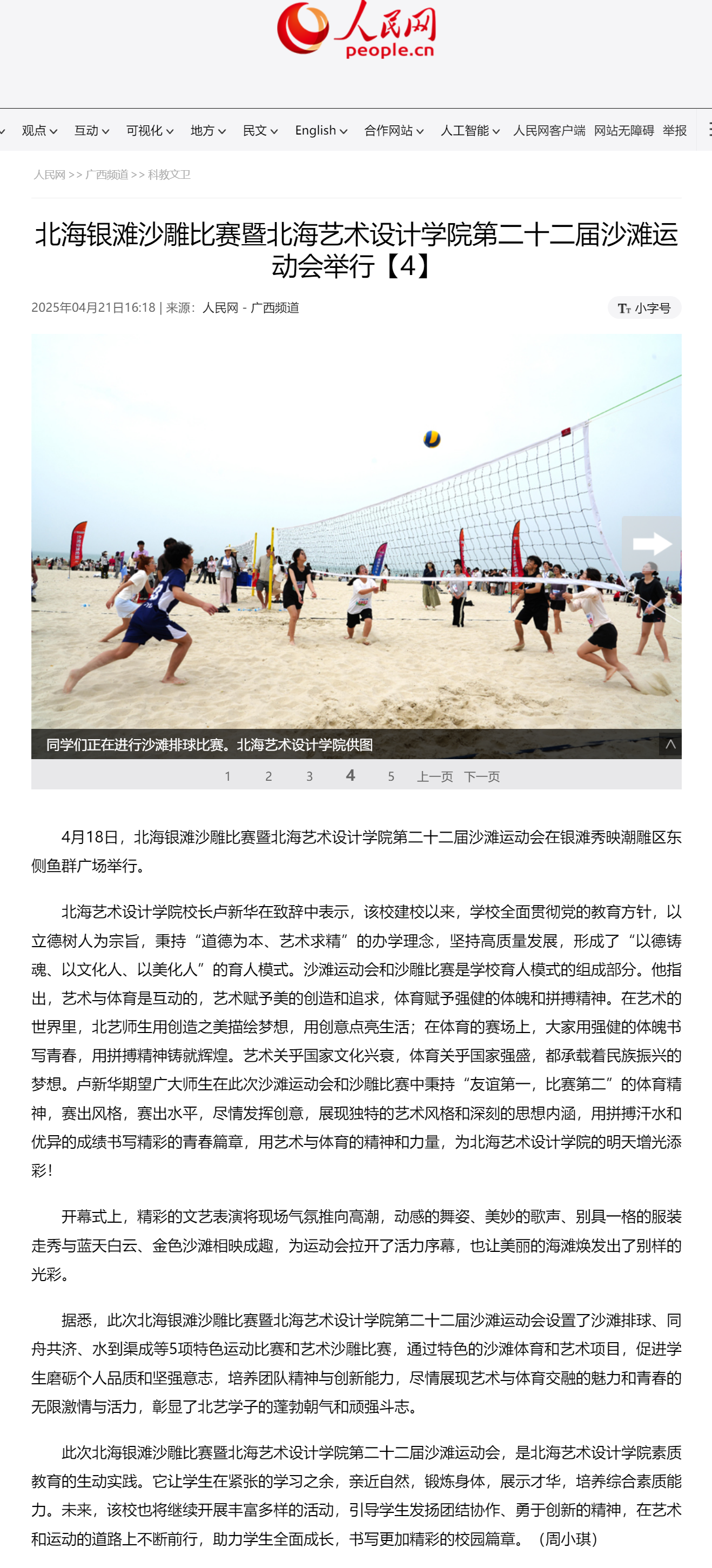 人民网:北海银滩沙雕比赛暨北海艺术设计学院第二十二届沙滩运动会举行