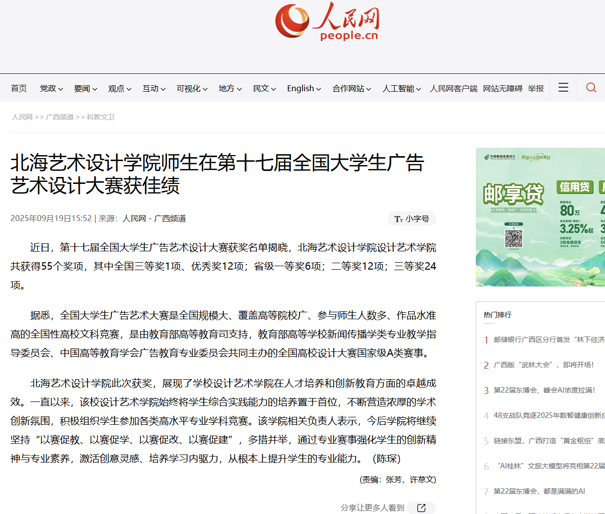 人民网:北海艺术设计学院师生在第十七届全国大学生广告艺术设计大赛获佳绩