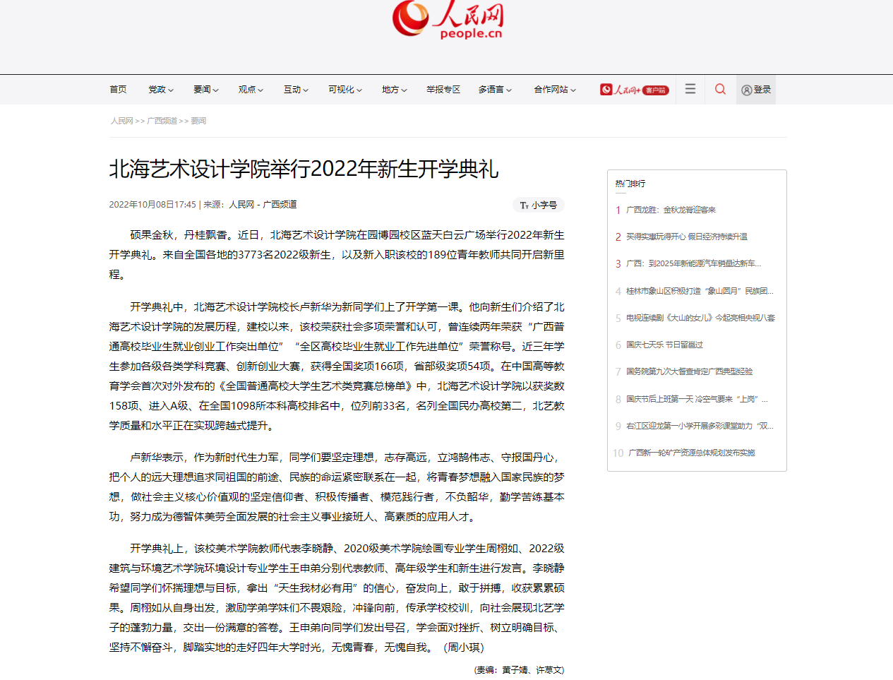 人民网:北海艺术设计学院举行2022年新生开学典礼