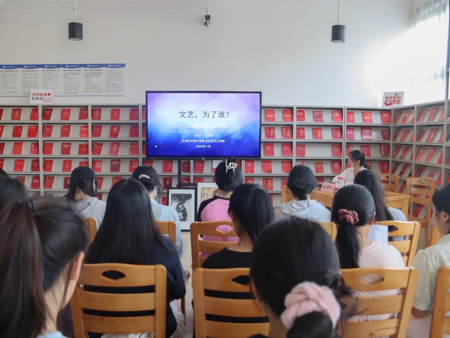 首先,王老师以《文艺,为了谁?——刀锋下的家国情怀》为题,整个讲座以木刻版画为核心抓手并贯穿始终,从“文艺究竟是为了谁”这个角度向大家讲述文艺是为人民服务的,文艺作品通过不同的艺术手法,反映人民的生活状态、情感世界和精神追求,为人民群众提供丰富的精神食粮。随后,王老师详细介绍了木刻版画独特的艺术语言和表现手法,深刻反映了时代的变迁和人民的奋斗历程。她指出,木刻版画同样在传承民族精神方面发挥着重要作用,不仅展示了民族的艺术魅力,更传递了民族的精神力量和价值观念。它还可以让人们更加直观地了解和感受民族文化的博大精深,不断增强民族自豪感和凝聚力。最后,王老师着重强调文艺该怎样为人民服务,创作无愧于时代的优秀作品,以人民为中心的创作导向,坚持创作贴近人民生活实际,只有这样,才能引起人民群众的共鸣和认同。