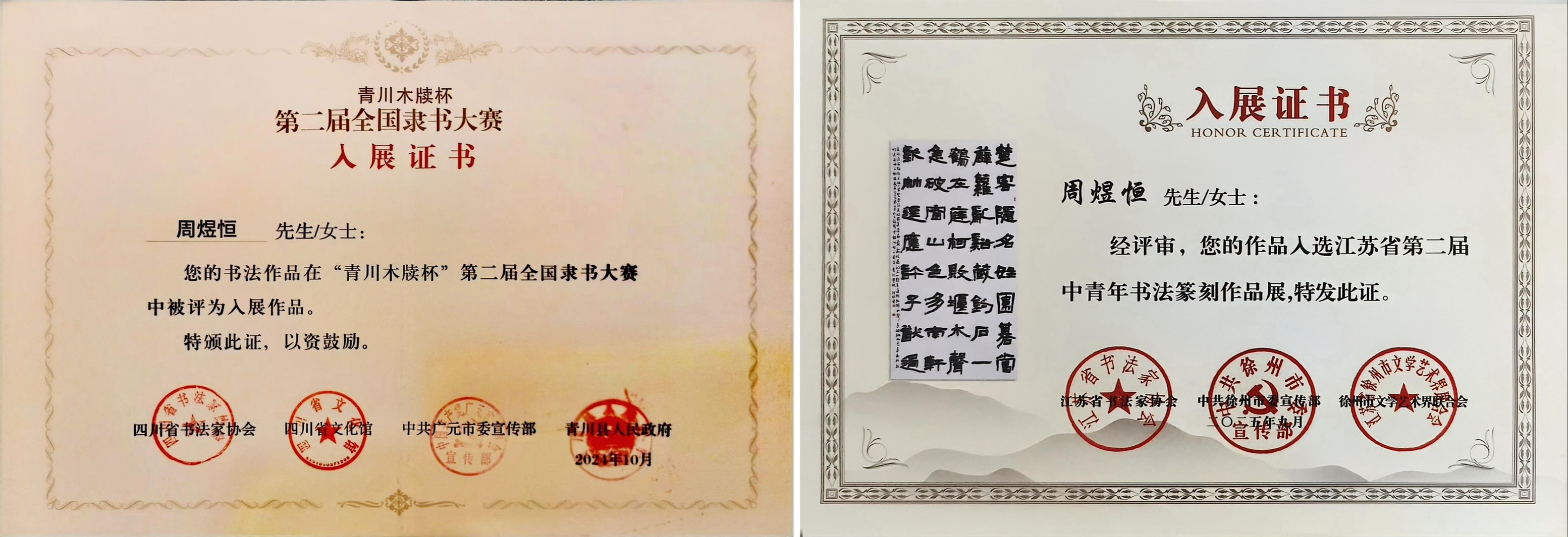 作为一名大三学生,周煜恒同学怀着对传统的敬畏之心与对技艺的执着追求,在笔墨世界里走出了一条既重传承、亦求突破的探索之路。身为江苏省书法家协会会员、徐州市书法家协会会员,他已在多个重要展览中崭露头角,作品入选江苏省第二届中青年书法篆刻作品展、“青川木牍杯”第二届全国隶书大赛、“伊秉绶奖”海内外隶书展等。