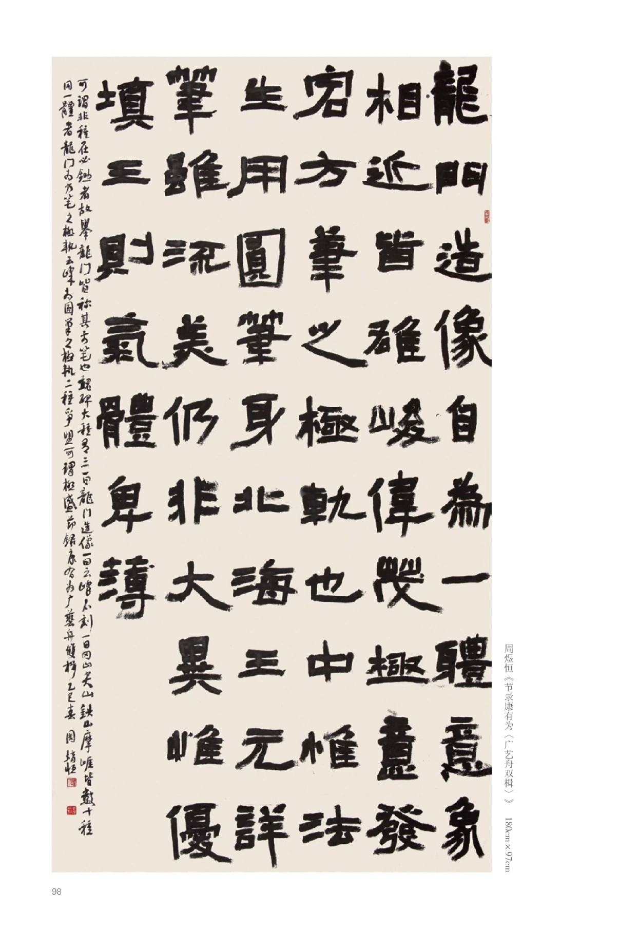 在书体选择上,周煜恒从大字隶书入手,逐步拓展至魏碑。他并未单纯依据个人性格或审美偏好,而是注重在成长阶段广泛涉猎。为了突破以往艺考训练中少写大字的局限,他有意识地加强手臂力量训练,使力量能沉稳贯注至笔端,从而在书写中更好地传达隶书的朴厚意趣与精神气象