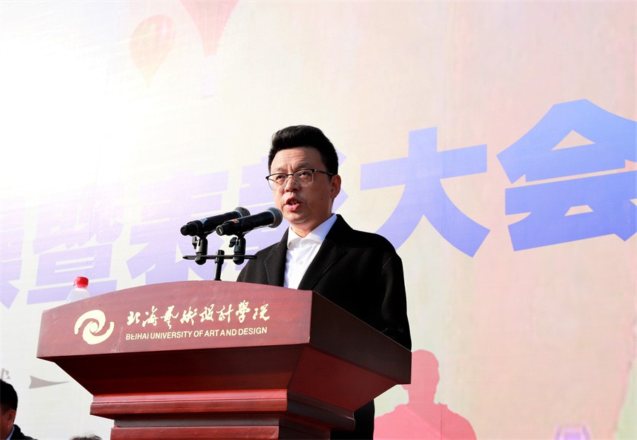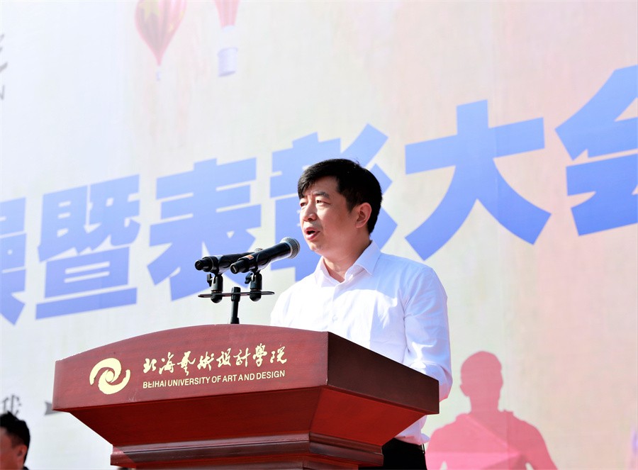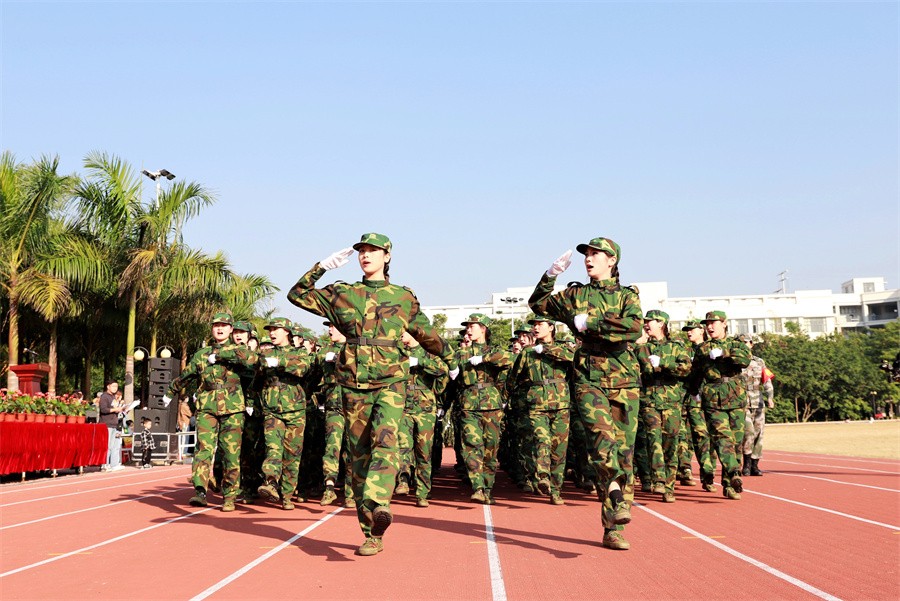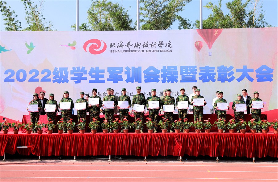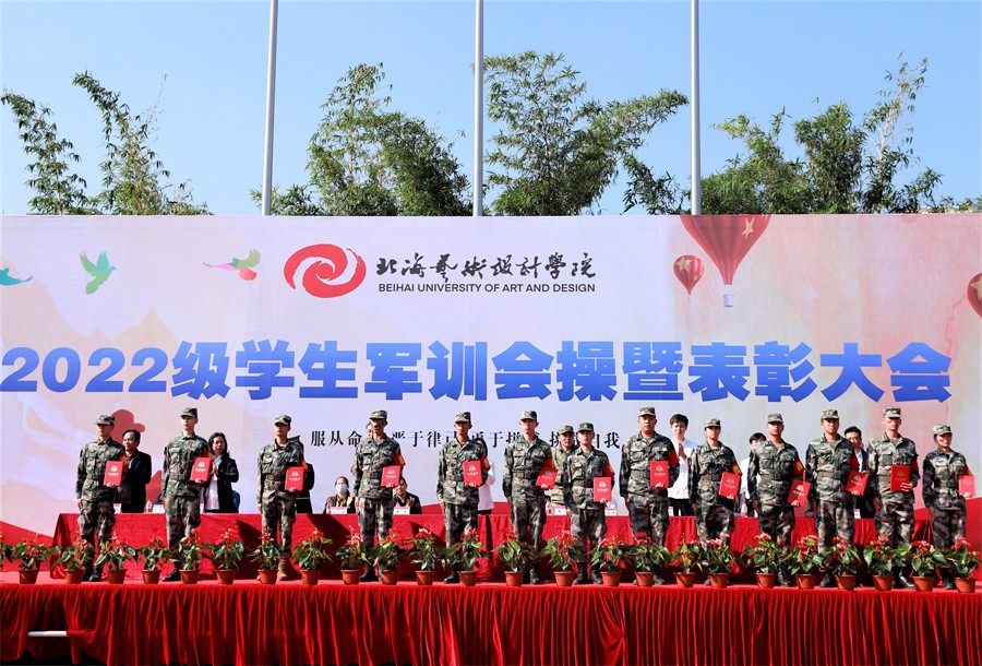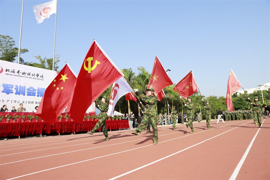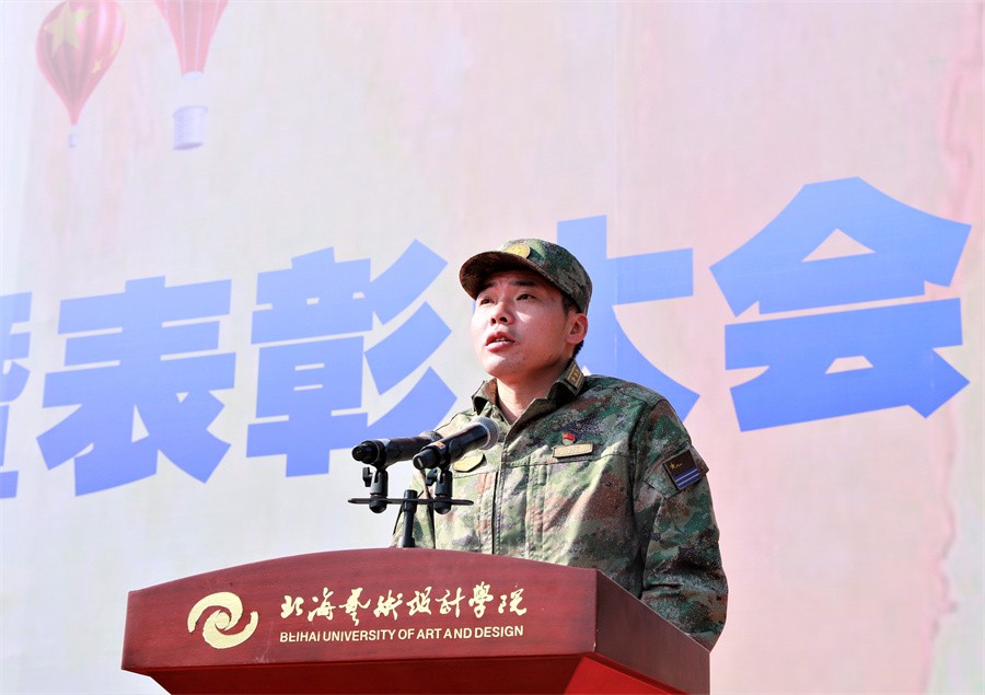 北海市海城区人民武装部政委王鑫在讲话中表示,此次军训时间安排紧、科目内容多、训练强度大,是一次体力与意志的较量、纪律与服从的检验。他对全体参训学生能够克服困难,出色完成所有军训任务的优良表现给予了高度评价和充分肯定。他强调,强国必须强军,军强才能国安,国防和军队建设,是国家安全发展的坚强后盾。近年来,北海艺术设计学院高度重视征兵工作,出台各种优待政策,鼓励学生积极报名参军,每年都有大批优秀学子走入军营,建设国防。他表示海城区征兵办作为学校学生应征入伍工作的办事机关,将继续竭诚为学校和广大学子做好应征入伍的各项工作。他呼吁我校广大学生在完成学业后,积极携笔从戎,参军入伍,为加强国防和军队现代化建设,实现建军一百年奋斗目标贡献力量。