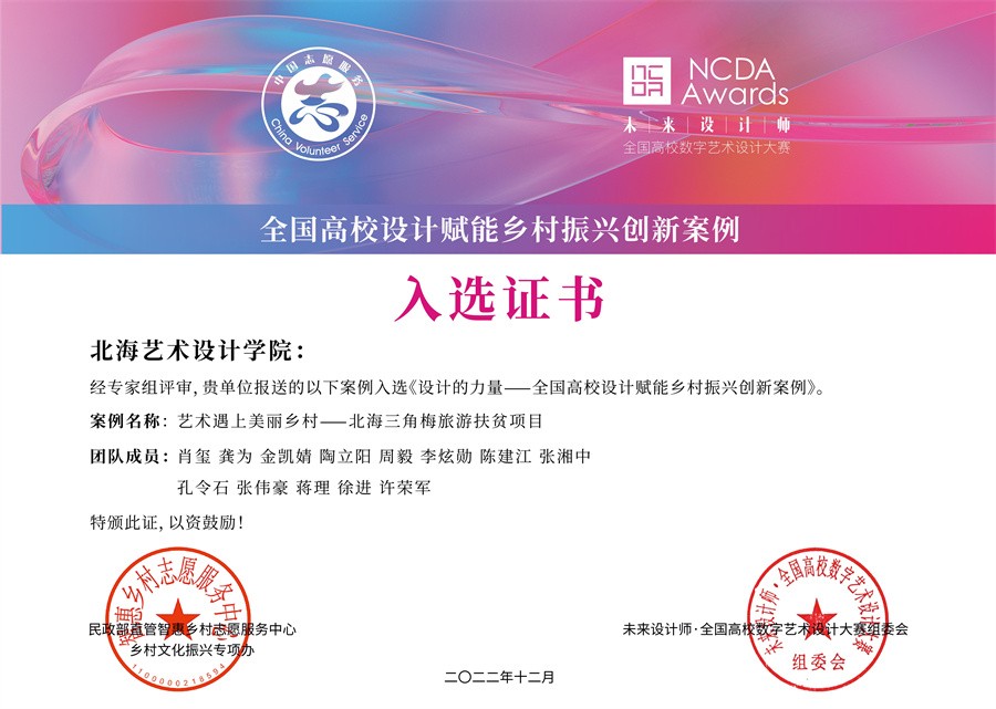 未来设计师·全国高校数字艺术设计大赛(NCDA)由工信部人才交流中心主办,教育部中国高等教育学会认可,已连续举办十届,是具有广泛影响力的国家级大学生设计学科竞赛。大赛秉承“设计为人民服务,培养未来设计师”的理念,近年来坚持设立“乡村振兴”赛项,鼓励高校师生开展设计助力乡村振兴创新实践,引导大学师生积极投身乡村振兴志愿服务,先后为中共嘉兴市委宣传部,中央红军长征出发集结地江西省于都县,革命老区江西省寻乌县,江西省全南县,江西省吉安市青原区,陕西铜川耀州区,内蒙古科右中旗等单位举办了乡村振兴系列活动。