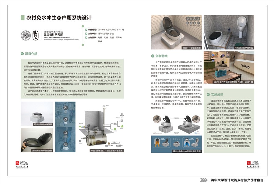 在刚刚结束的2022第十届未来设计师·全国高校数字艺术设计大赛中,主办方征集到一万余件以乡村振兴为主题的设计作品,涌现了一大批为乡村做设计的志愿者。作为“我为乡村做设计”另一项主题活动,“全国高校设计赋能乡村振兴创新案例”征集活动也得到了高校的积极响应,共收到近500个申报案例。优秀实践案例不断涌现,如清华大学美术学院生态设计研究所刘新教授针对中西部传统农村旱厕存在的诸多问题,设计出适用于用水不便地区的农村家庭人性化免水冲便器及环境友好的生态粪尿处理系统,可广泛应用于水源匮乏并缺少市政管网设施的地区。来自重庆交通大学建筑与城市规划学院的多个教师团队近几年已走出设计赋能乡村振兴的特色之路,如董莉莉院长团队和姚阳老师团队分别对重庆市江津区中山古镇进行了抢救性修缮规划设计,对重庆市万盛经开区丛林镇绿水村开展了乡村艺术系列活动策划等。经主办方和专家评审,从中精选140个案例汇编成册,由上海交通大学出版社正式出版《设计的力量——全国高校设计赋能乡村振兴创新案例》一书,向社会各界展示高校设计教学创新与大学师生以创意助力乡村振兴的成果。