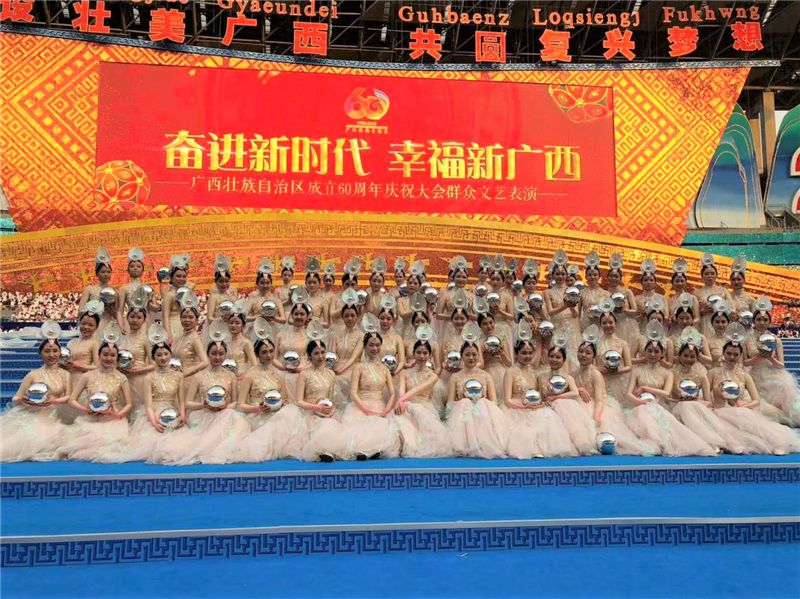 在庆祝大会前期,我校教育学院70名学生,他们不畏艰苦,任劳任怨,经过一个多月的紧张排练,以一流的表演水平顺利地完成了自治区、北海市和学校交付的光荣任务,为庆祝大会文艺演出贡献了北艺的一份力量!