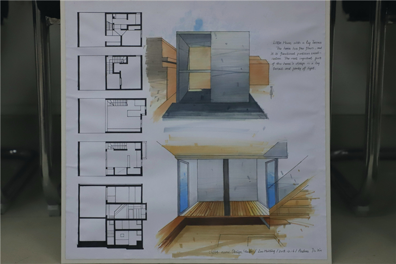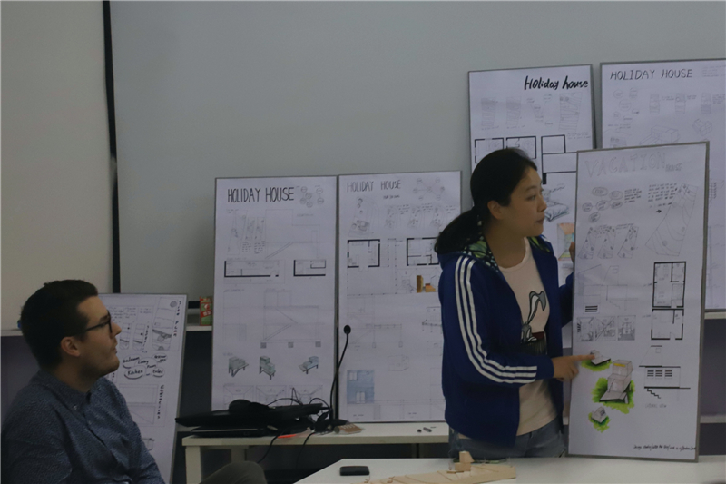 国际班的罗慧婷同学率先进行作品《HOLIDAY HOUSE》的展示汇报。接下来温瑞秋、常奇明、霍晋东、仲彤、琚司蒙、曾宏六位同学也依次携作品《VACATION》、《Building Eyes》、《HOLIDAY HOUSE》、《HOLIDAY HOUSE》、《Holiday House》、《An Interesting Buiing》进行了各自的展示汇报。让官微君印象深刻的是常奇名同学的作品,他在介绍自己的建筑设计方案时提到:“因为屋顶与地面平行,我的建筑是和整个森林、整个世界融为一体的,而不是那么突出显眼。我的建筑三个面都是玻璃,有着更宏大的视野,给人一种更贴近自然的感觉。”生动展现了他设计中的自然和谐气息概念。