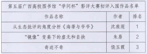 根据《第五届广西高校图书馆“学问杯”影评大赛》的评选要求,图书馆邀请我校四位专家教授对28篇查重合格的作品进行初评,现将初评入围名单公示如下: