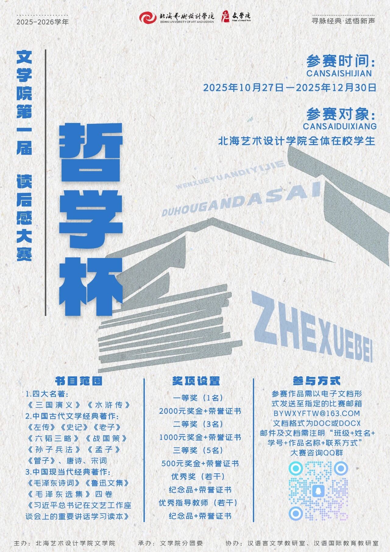 为深入贯彻新时代全民阅读理念,引导广大青年学子从经典中汲取思想力量,在哲思中涵养精神品格,北海艺术设计学院文学院于2025年10月27日至12月30日举办第一届“哲学杯”读后感大赛。这不仅是一场文字的盛宴,更是一次与伟大思想对话的心灵之旅。