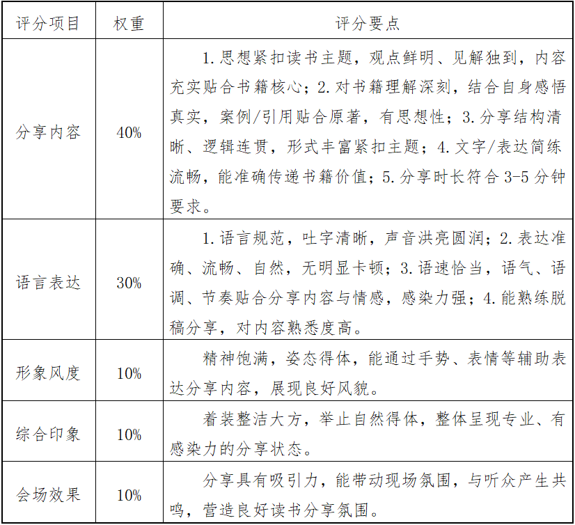 受邀读书会现场分享同学根据提交作品,进行3~5分钟的分享,评审团根据以下标准对决赛作品进行现场打分(总分100分):