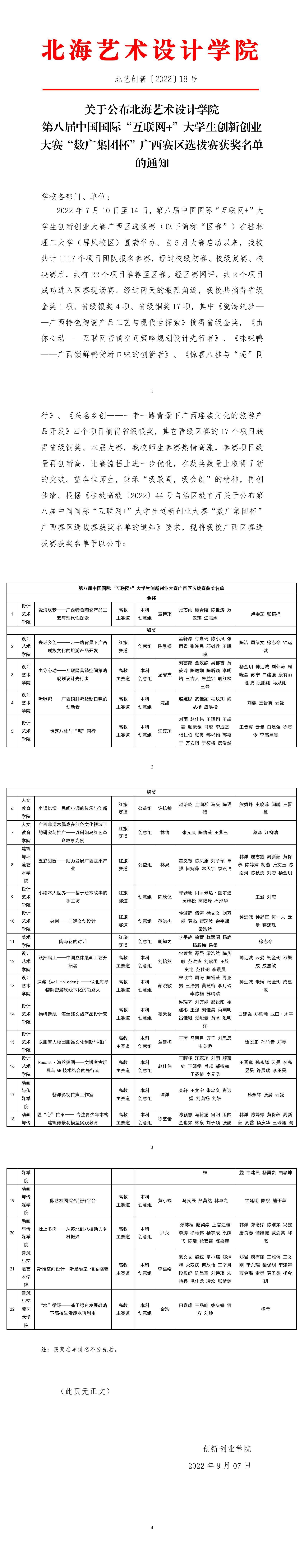 北艺创新〔2022〕18号关于公布北海艺术设计学院第八届中国国际“互联网+”大学生创新创业大赛“数广集团杯”广西赛区选拔赛获奖名单的通知