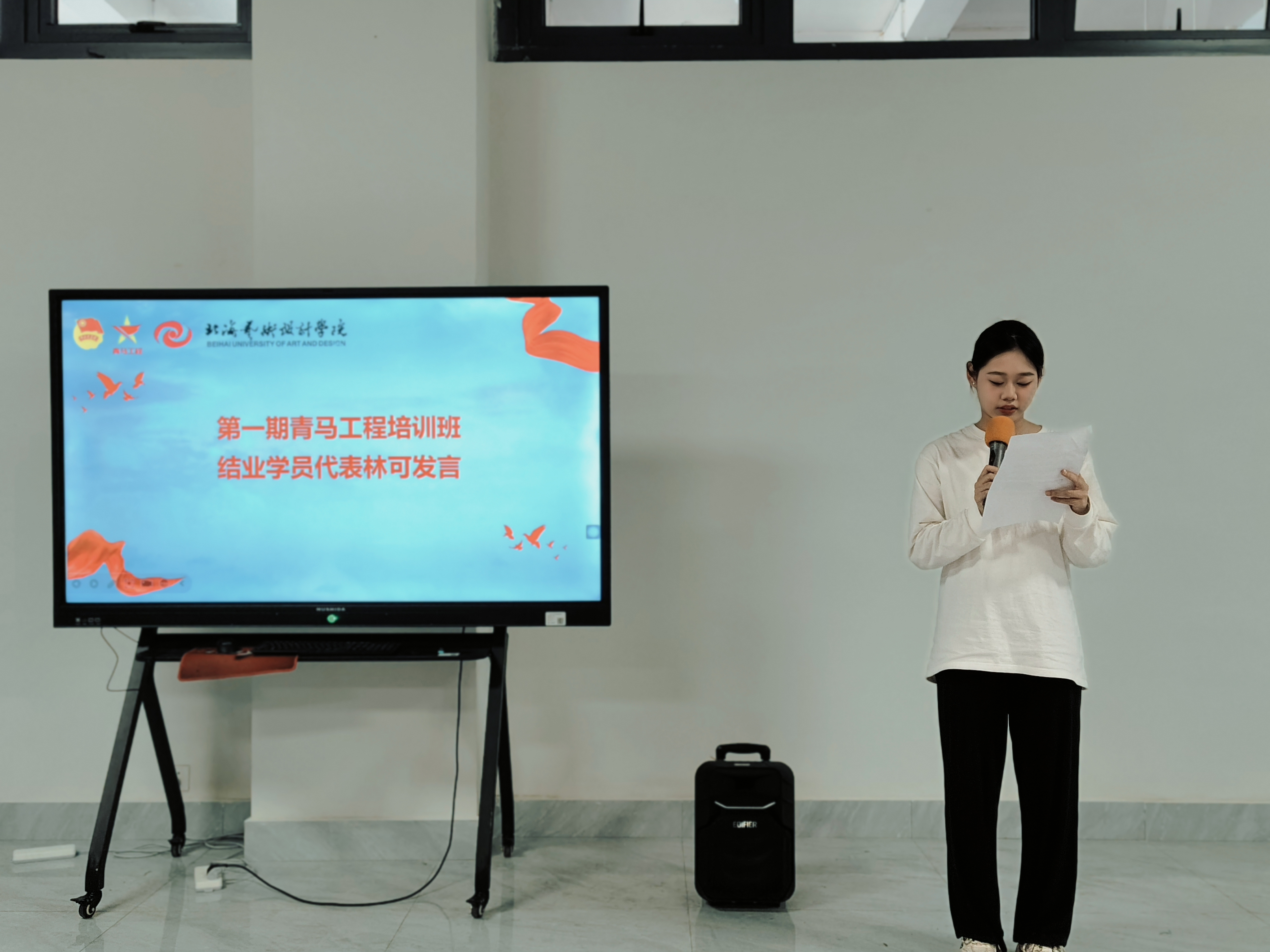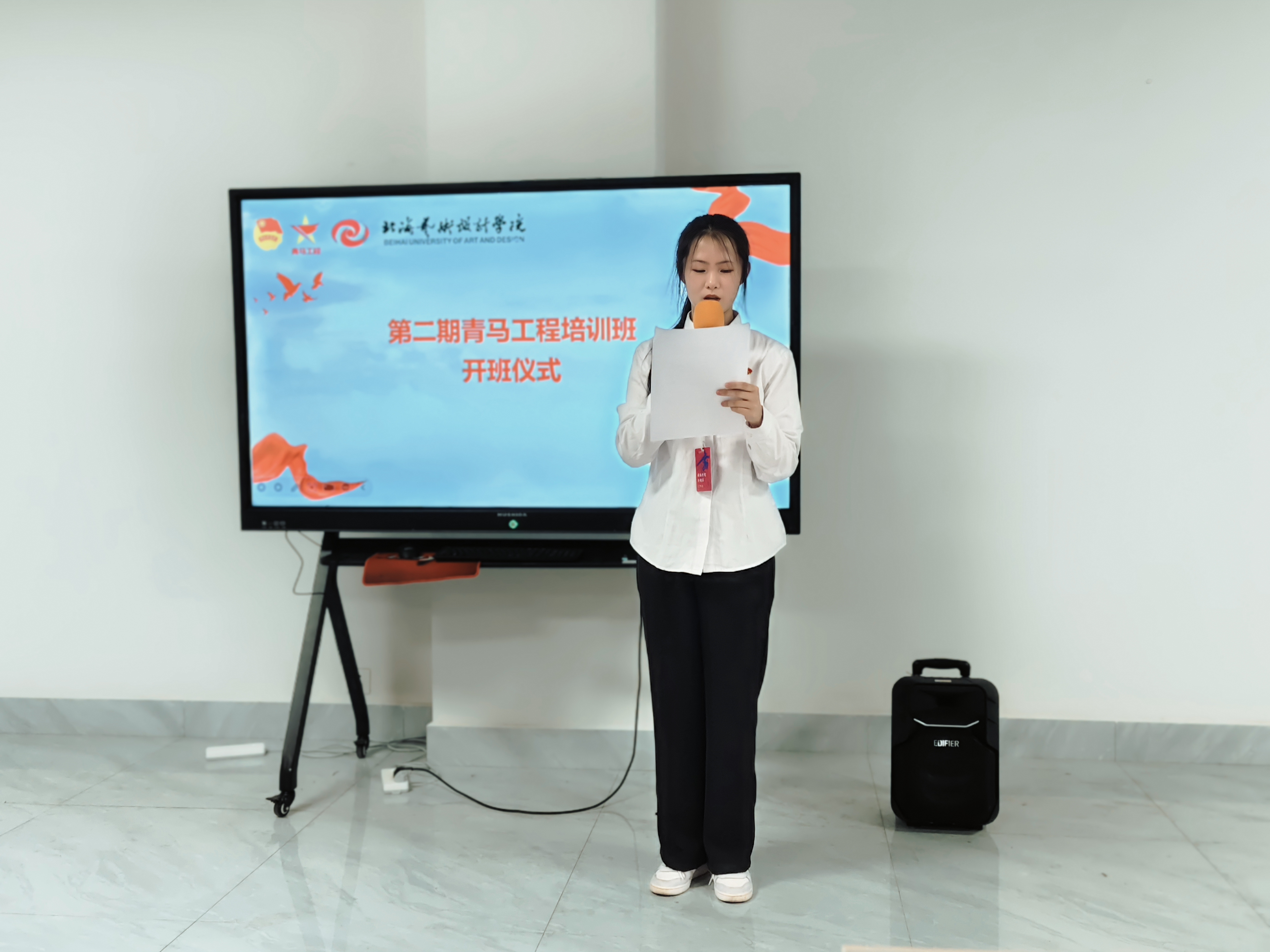 仪式在庄严的国歌声中拉开帷幕。首先,第一期青马工程培训班结业学员代表林可上台发言,她回顾了自己在青马工程培训班的难忘经历,分享了学习马克思主义理论的心得体会以及在实践中锻炼成长的感悟。同时,她向第二期学员送上了诚挚的祝福和宝贵的建议,鼓励新学员们珍惜机会,努力学习,以实际行动践行马克思主义精神,在新时代的征程中书写属于青马人的辉煌篇章。