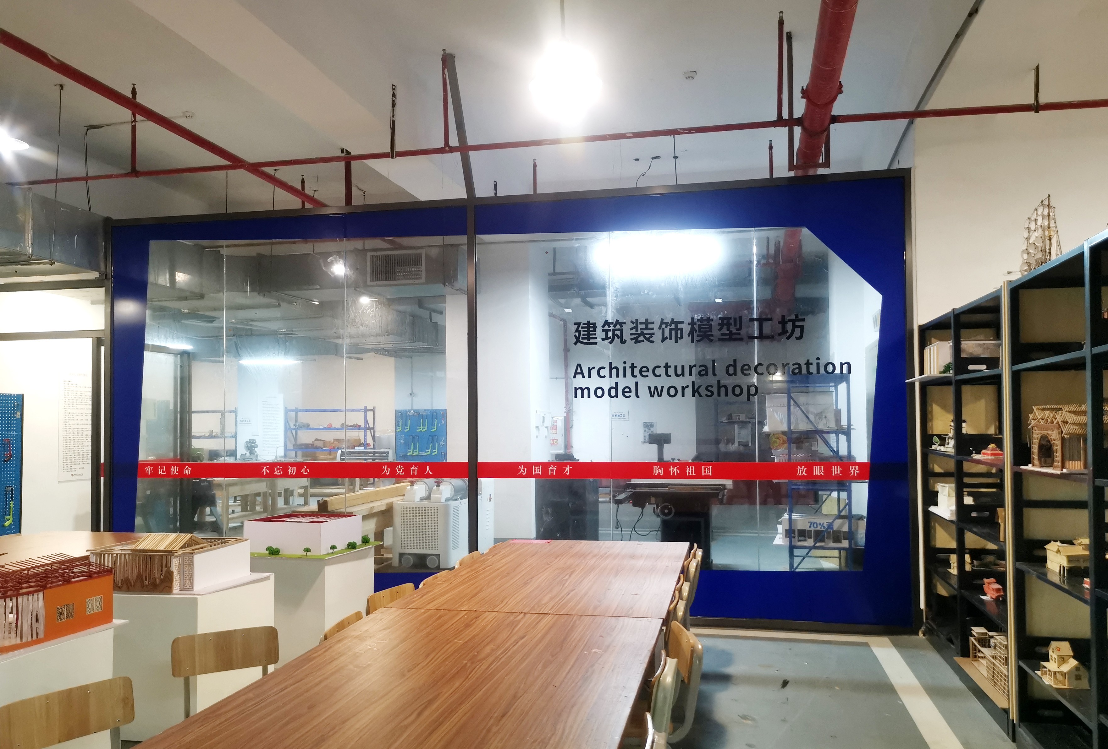 该模型工坊专门服务于环境设计专业实验教学、实践工作。主要服务的设计课程:展示空间设计、陈设设计、景观设计、家具设计、创新创业课等;用于承担本专业的实验项目有展示空间模型制作、陈设设计模型制作、家具模型制作、景观模型制作、创业启蒙、创新创业实践等创新创业实验项目等。
