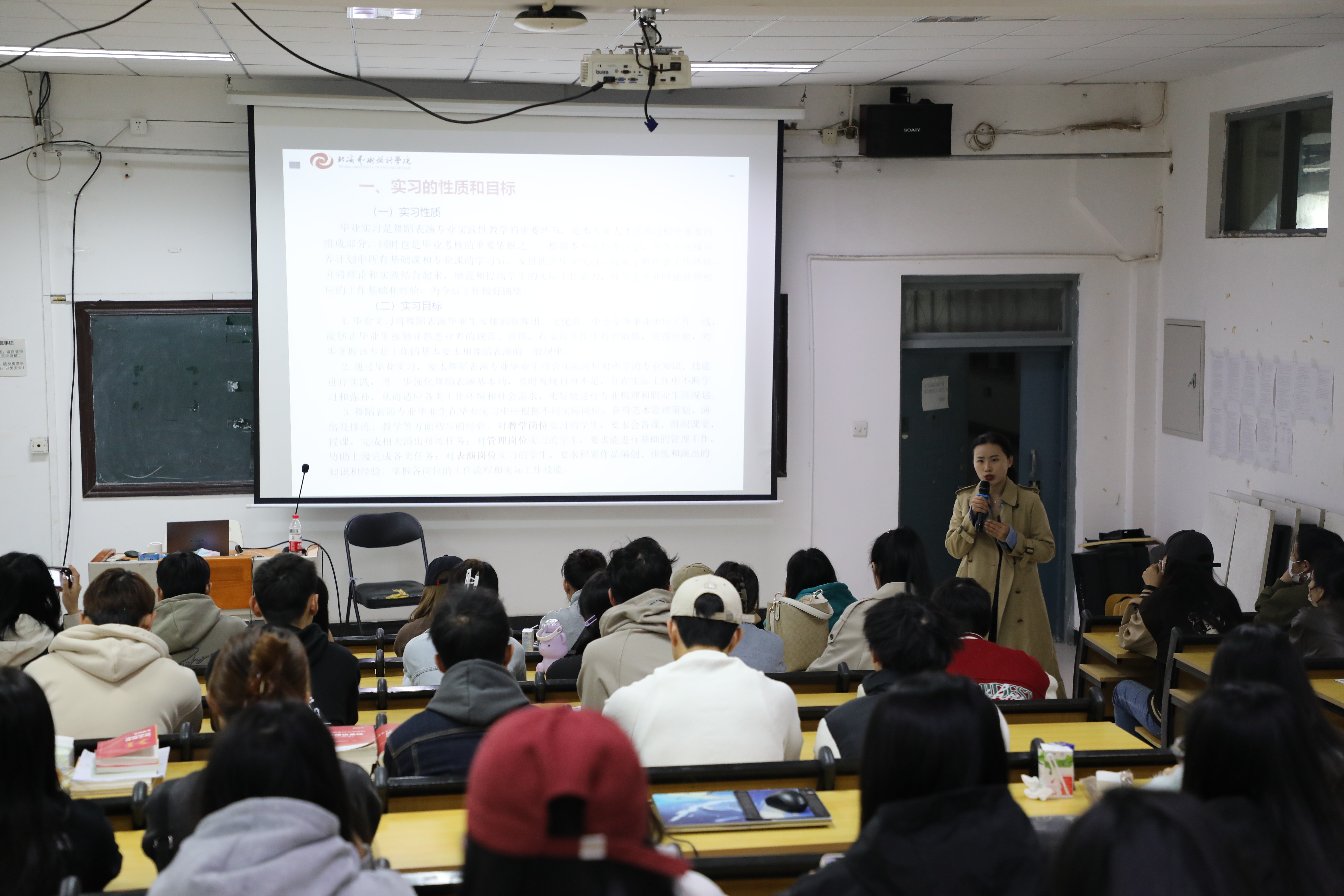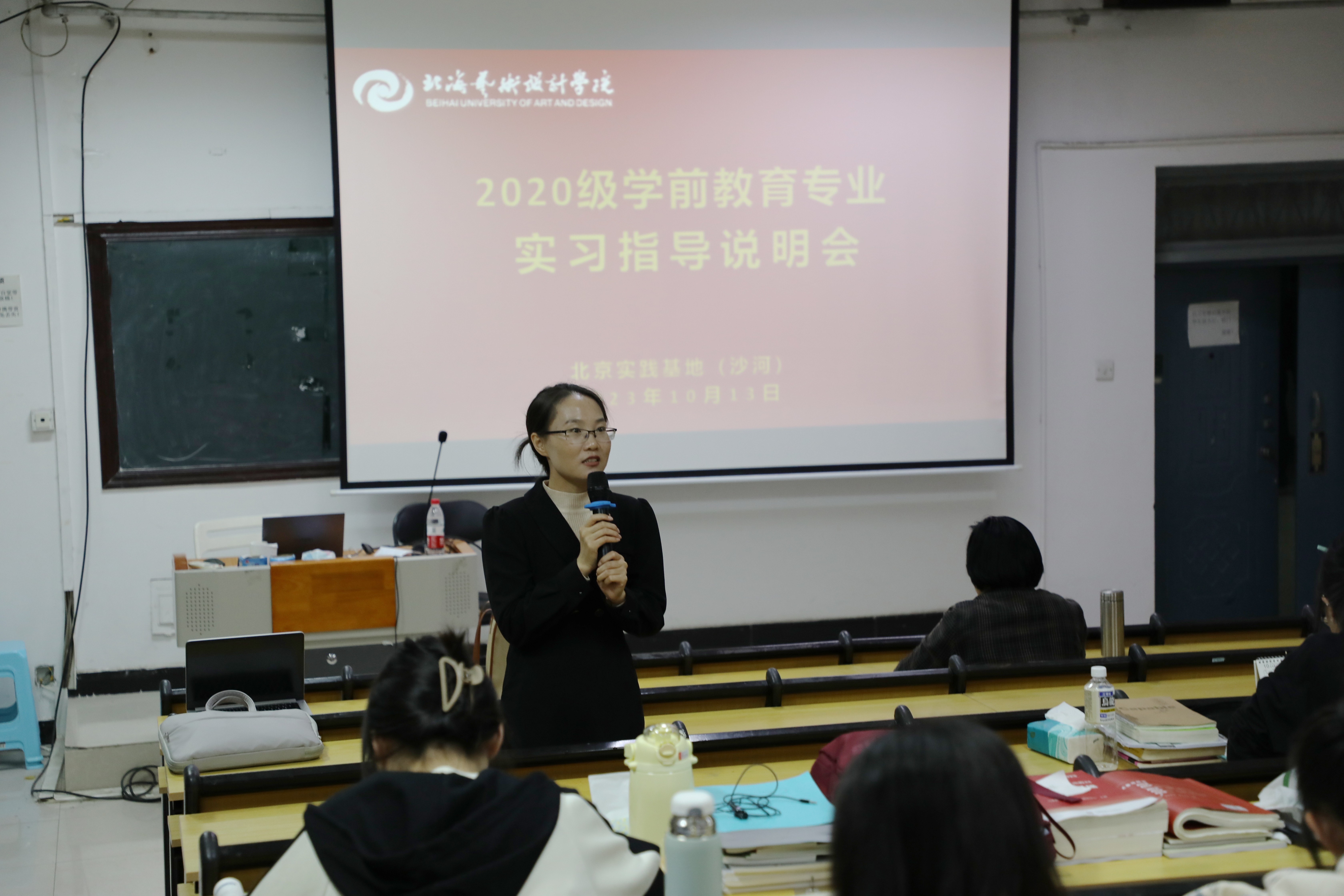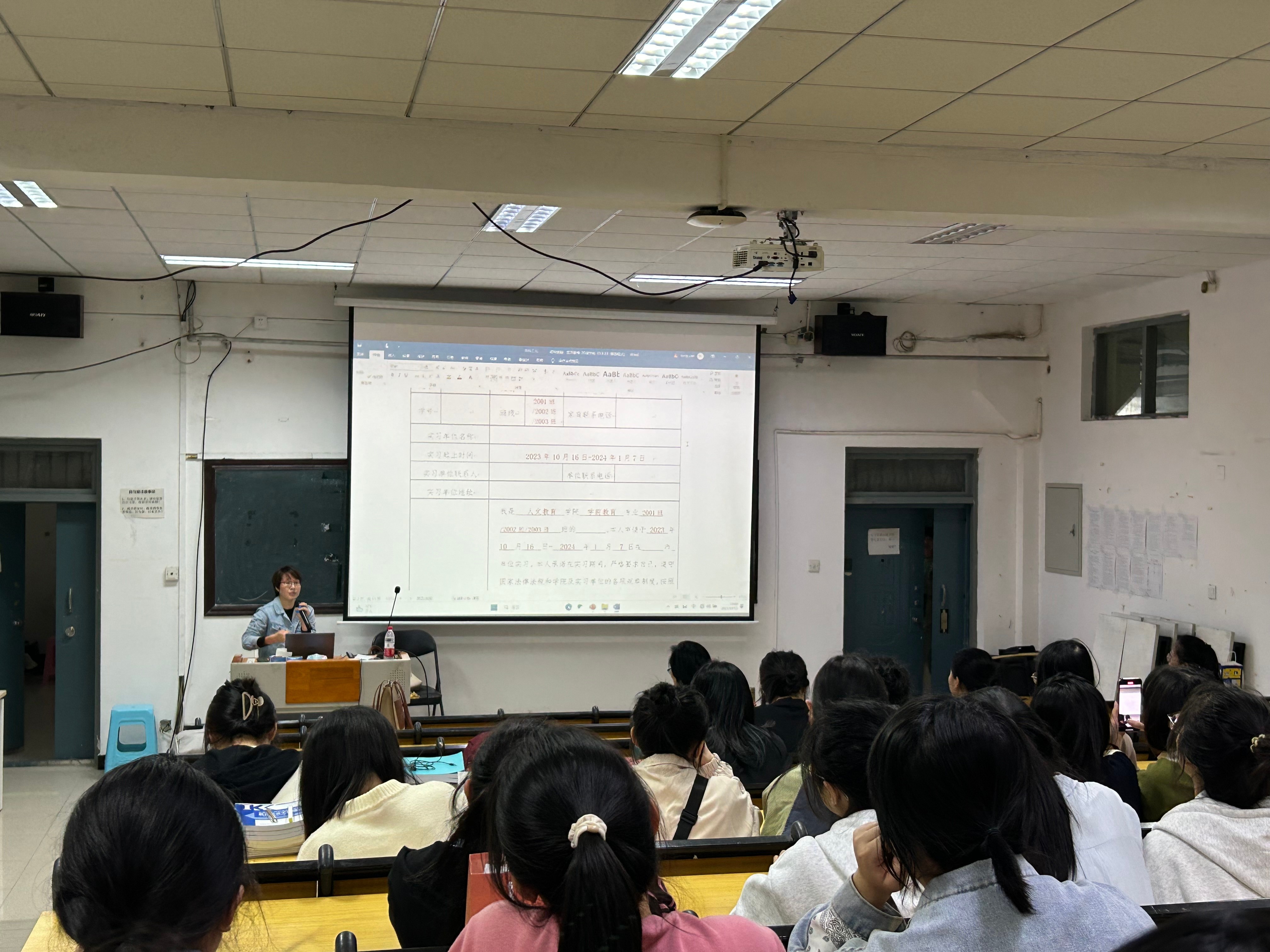 为了扎实做好2024届毕业生实习工作,进一步促进学生对所学知识和技能进行实践运用、总结和深化,引导学生明确毕业实习的目的和意义。2023年10月13日晚,人文教育学院在北京实践基地(沙河)阶梯教室召开2024届学前教育、舞蹈表演毕业实习指导会。出席本次会议的有北京实践基地办公室副主任严腾、人文教育学院党总支副书记邓欢、学前教育教研室主任蒙剑英、实验室副主任冯小霞。