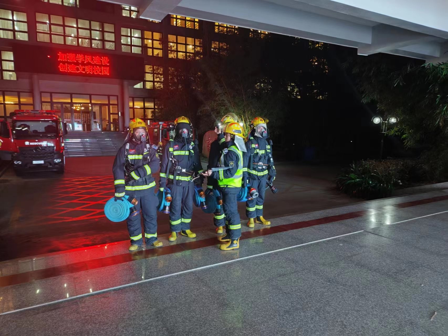 通过此次演练,有效提升了消防员对校园情况的熟悉,为以后各项灭火救援工作打下了良好的基础。(冯海波/摄)