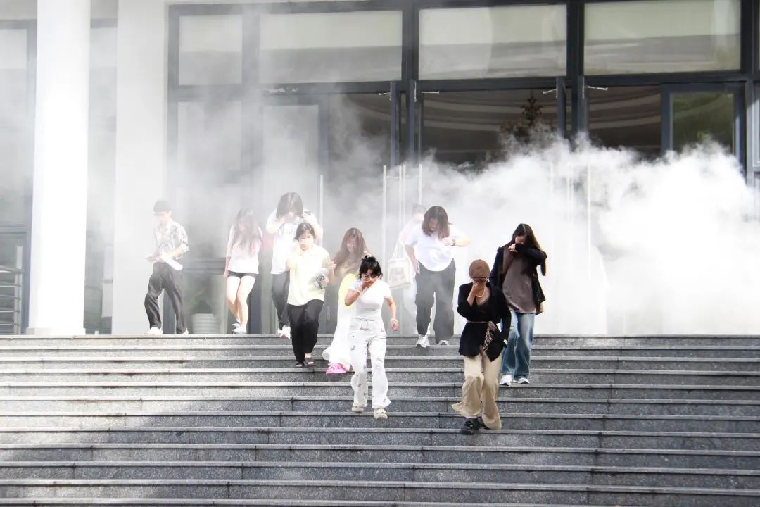 随后,图书馆消防疏散演练拉开帷幕。美术学院学生代表在图书馆、保卫处工作人员的引导下,用湿毛巾捂住口鼻,弯腰低姿,按照预定疏散路线,从图书馆阅读室迅速、有序地疏散至图书馆北门前。整个演练过程紧张有序,学生们动作规范,展现出良好的应急反应能力,达到了预期的演练效果。消防活动现场还设置了沉浸式消防体验环节,全体参演人员及众多闻讯而来的师生积极参与体验。图书馆门前,大家争相体验穿越烟道火场逃生,学习穿戴自救呼吸器,在工作人员的指导下操作消防车、灭火器灭火,校医务室人员进行心肺复苏演示和指导。通过亲身体验,师生们对消防安全知识有了更直观、更深刻的理解,自护、自救和互救能力得到有效提升。