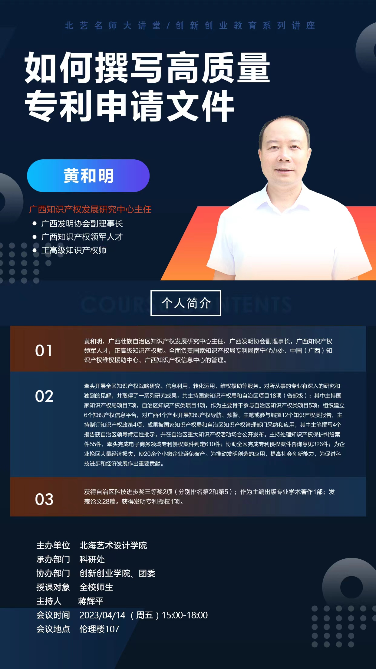 为鼓励全校师生积极申报专利、提升科研水平,促进专利数量和质量的持续增长,特邀请广西壮族自治区知识产权发展研究中心黄和明主任应邀来我校开展《如何撰写高质量专利申请文件》讲座。讲座由科研处副处长蒋辉平主持。