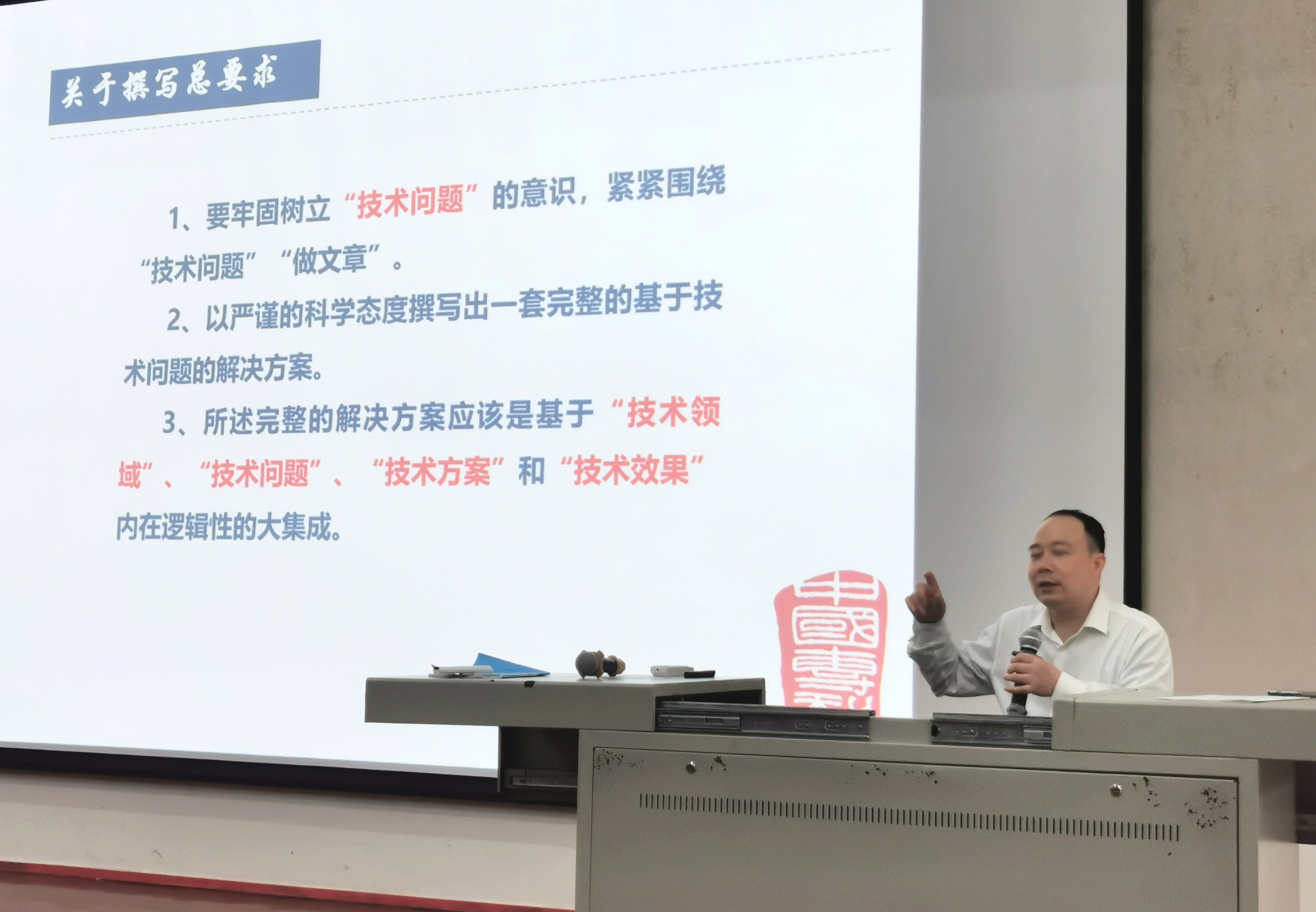 讲座分两个时间段,上半段以结合展示实物进行理论描述为主;下半段侧重详细分解说明书附图、权利要求书、专利说明书,对申报过程中会运用到的写作技巧进行了系统化阐述。最后,采取对比的手法,重点讲解了外观专利、实用新型专利和发明专利的异同。