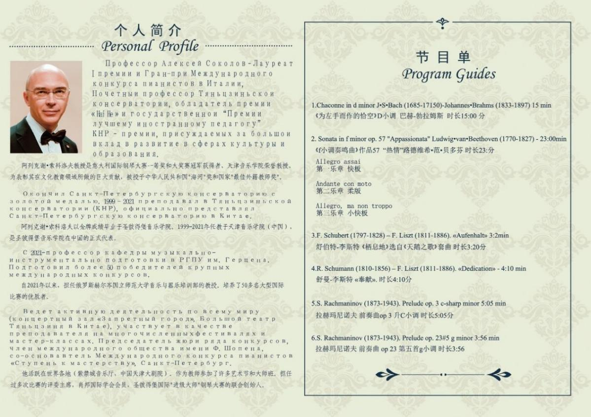 阿列克谢•索科洛夫教授是意大利国际钢琴大赛一等奖和大奖赛冠军获得者天津音乐学院荣誉教授,荣获中华人民共和国"海河"奖和国家"最佳外籍教师奖"。他活跃紫禁城音乐厅中国天津大剧院等世界各地,培养了50多名大型国际比赛的优胜者,联合创办了圣彼得堡国际"进级大师"钢琴大赛。
