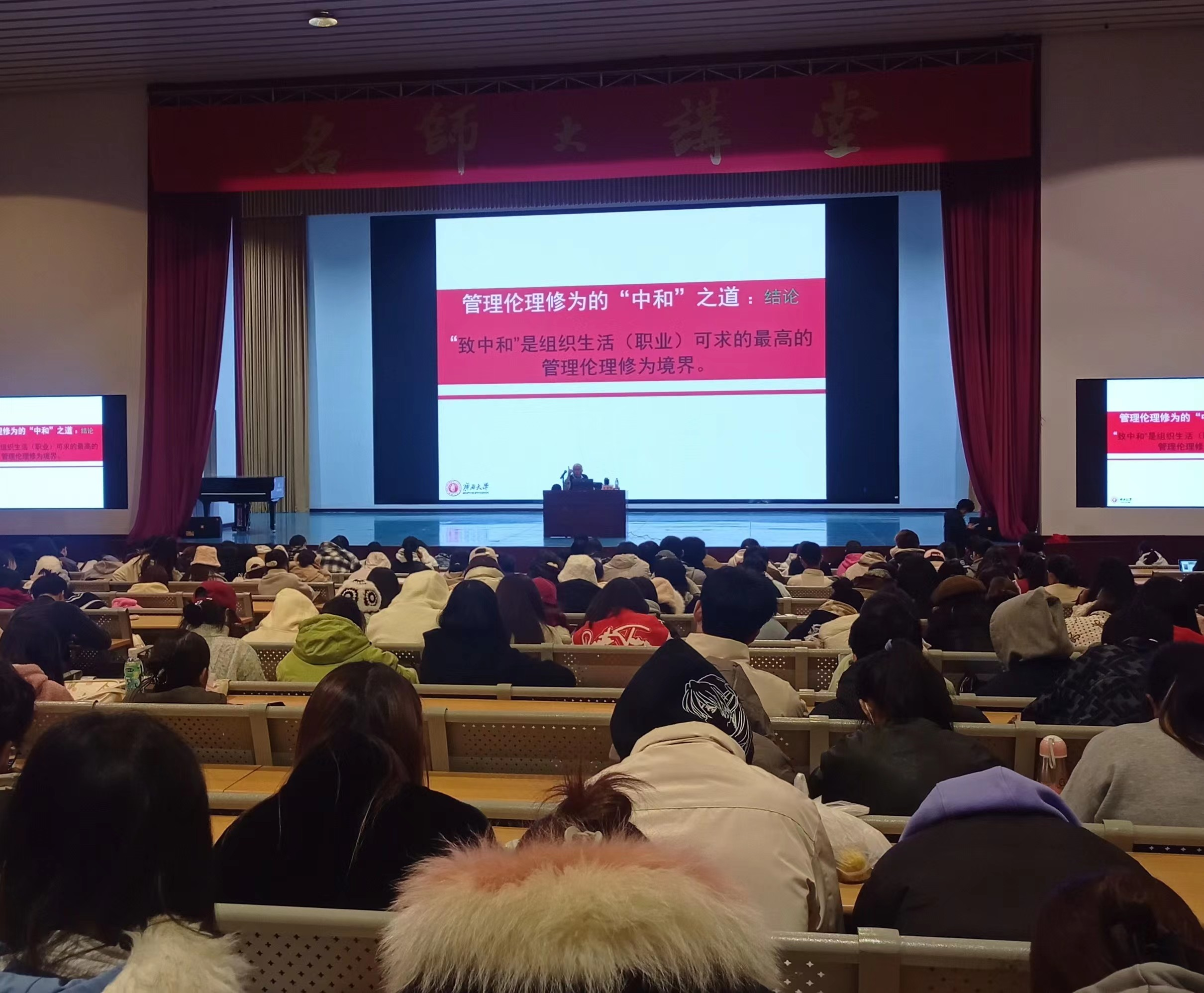 12月18日晚,广西大学公共管理学院王玉生教授应邀于我校西校区大礼堂,为广大师生带来了一场题为《管理伦理修为中的“中和”之道》的精彩讲座。讲座旨在分享管理中的“中和”哲学思想以及人生需要掌握的协调平衡思维。讲座由人文教育学院名誉院长蒙绍荣教授主持。