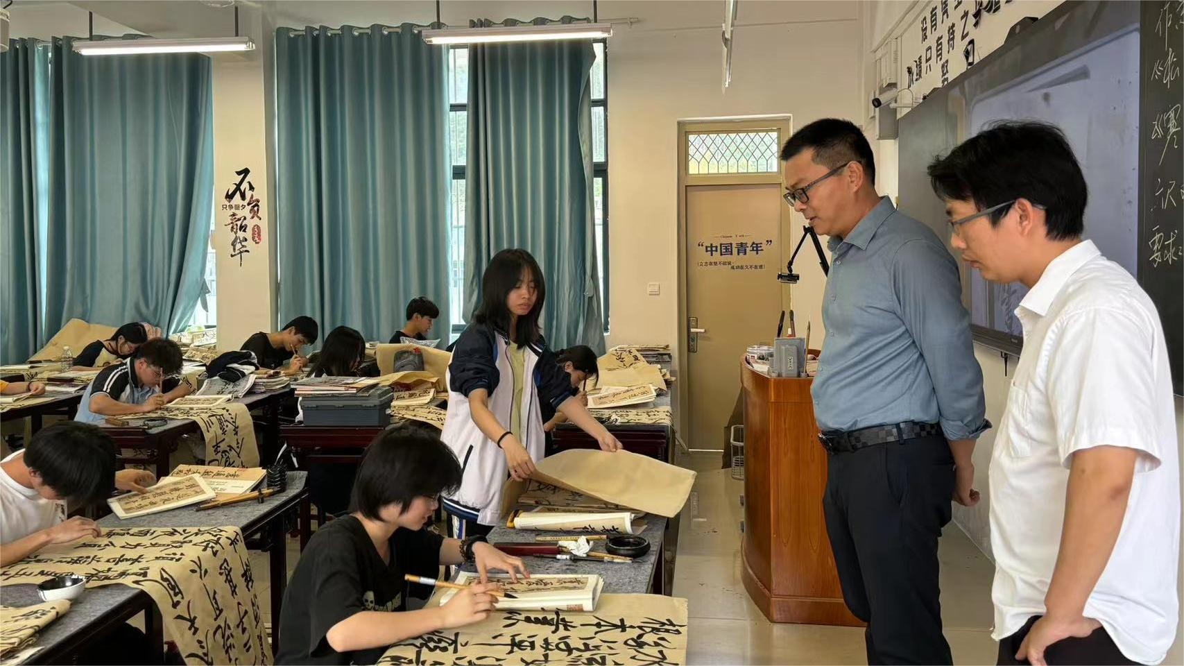 同日,我校美术学院书法学教研室教师代表赴南宁市马山县第三高级中学开展专业课程考察活动。双方就“徳、艺、美”三位一体教学模式展开讨论,并参观考察了书法课堂、美术课堂以及体育课堂。(李东垚 摄)