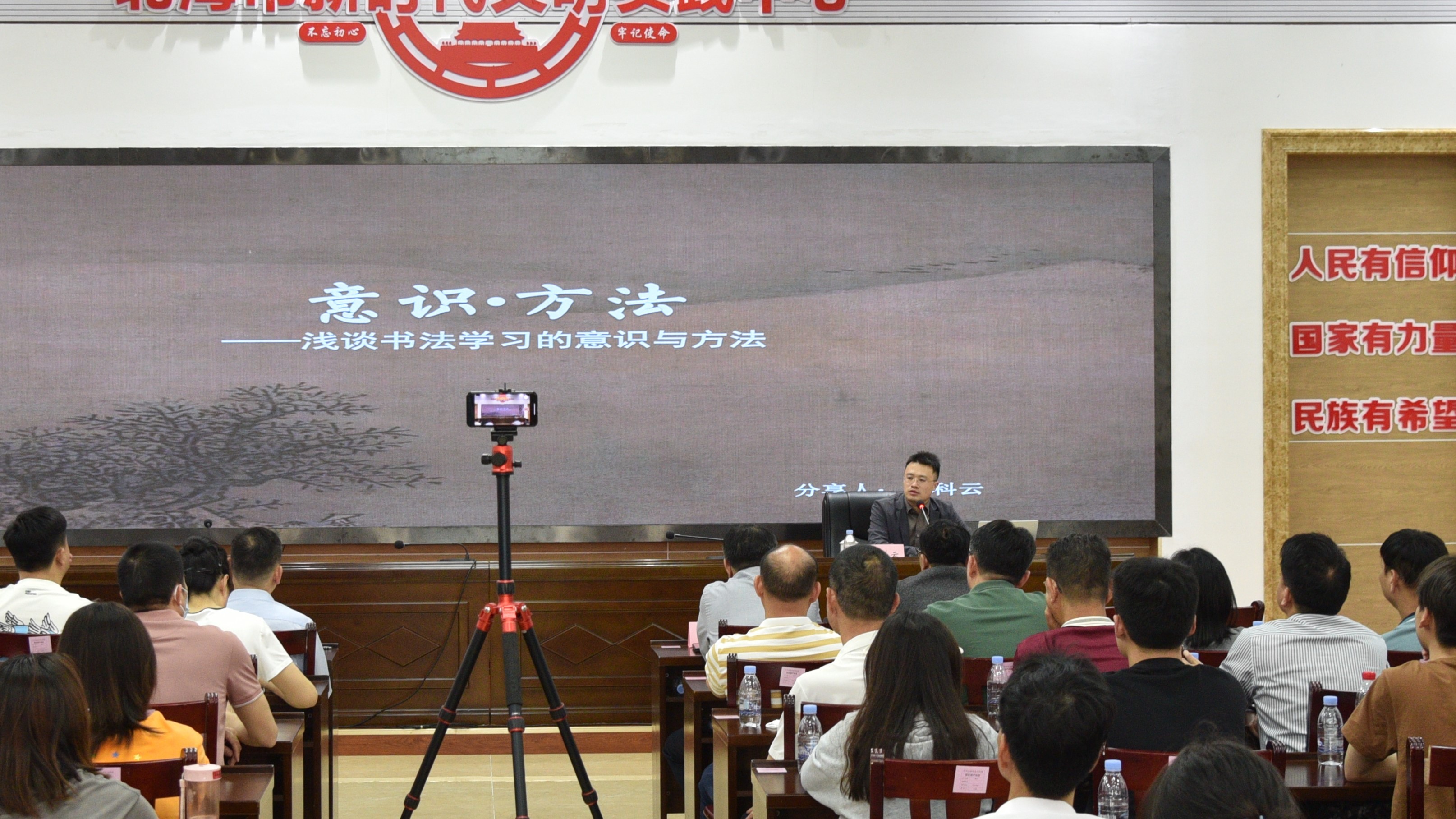 杨科云主席展开以“书法学习的意识与方法”为题的书法专题讲座,杨主席在讲座伊始便指出书法作为非单纯技术性艺术形式的特殊性,与美学、国学、史学、文学等学科精神均联系紧密。由文字与书法、非自觉时期的书法艺术、自觉时期的书法艺术三方面展开,以中国文字的发展演变过程深入对自觉时期书法艺术的深入解读。在针对脱离功用性的书法艺术讲授中,杨主席明确该时期书法的空间、时间两大特性,并详细阐释书法艺术的文化属性、文学属性、文字属性、审美属性;审美视角中的章法问题、墨法问题、字法问题、笔法问题;书法创作中的临创意识、取舍意识、转化意识、化用意识。