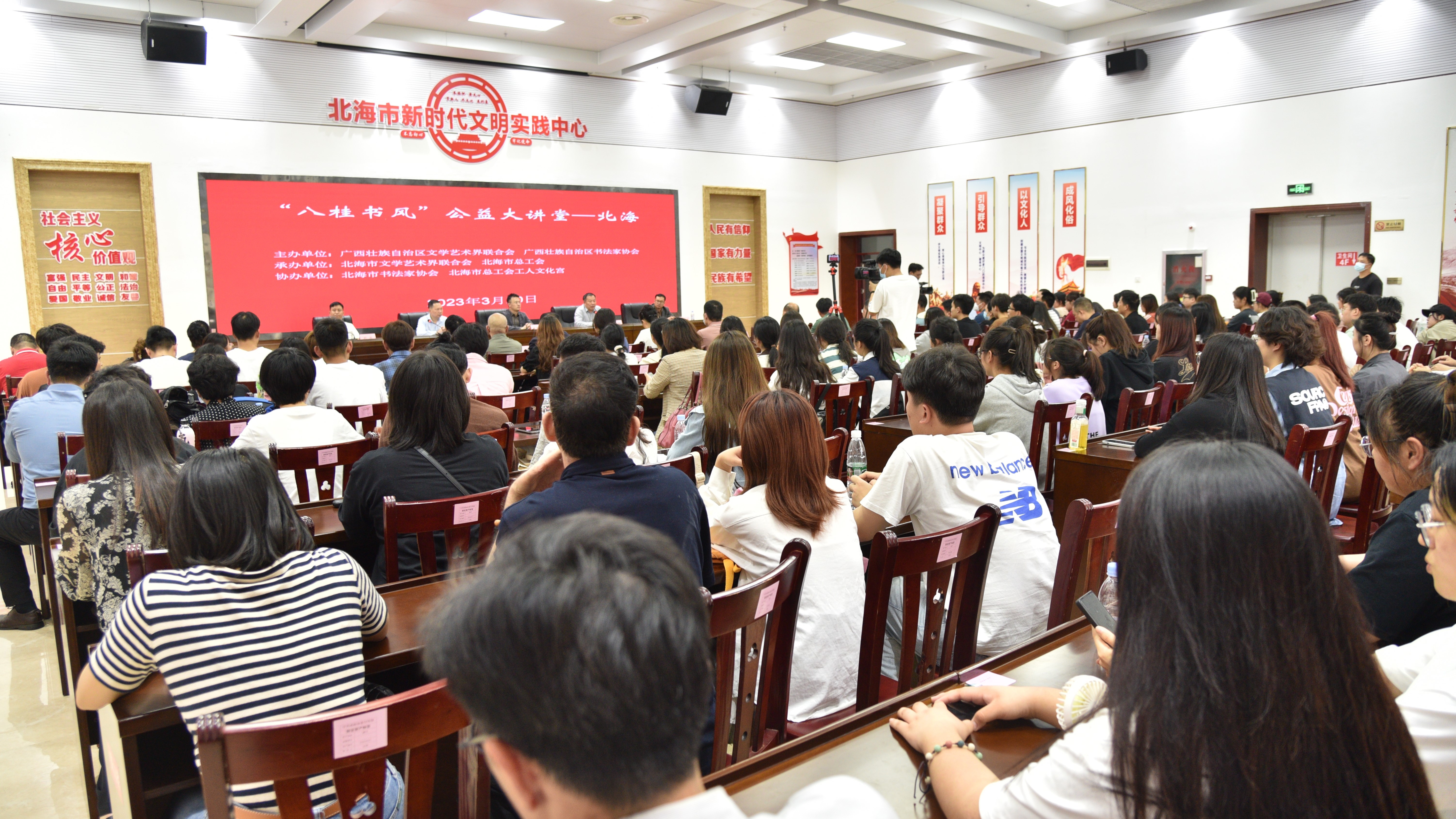 2023年3月20日下午,北海艺术设计学院美术学院书法专业师生前往北海市工人文化宫参与“八桂书风”公益大讲堂。本次讲座是由广西壮族自治区文学艺术界联合会、广西壮族自治区书法家协会主办,广西壮族自治区书法家协会主席杨科云主讲的公益书法课堂讲座。