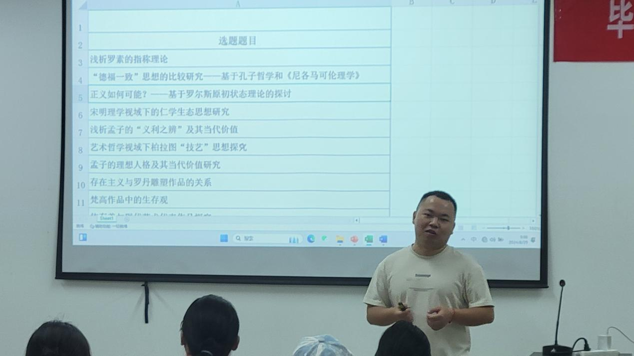 为进一步明确毕业论文选题要求,推动毕业生论文指导工作,8月29日上午10点,哲学学院教研室赴北京实践基地(沙河校区)励行楼五教室召开了2025届学生毕业论文选题指导会。学院常务副院长李水亮、哲学教研室副主任余余及学生班主任程祥老师出席了本次会议。会议由余余副主任主讲。