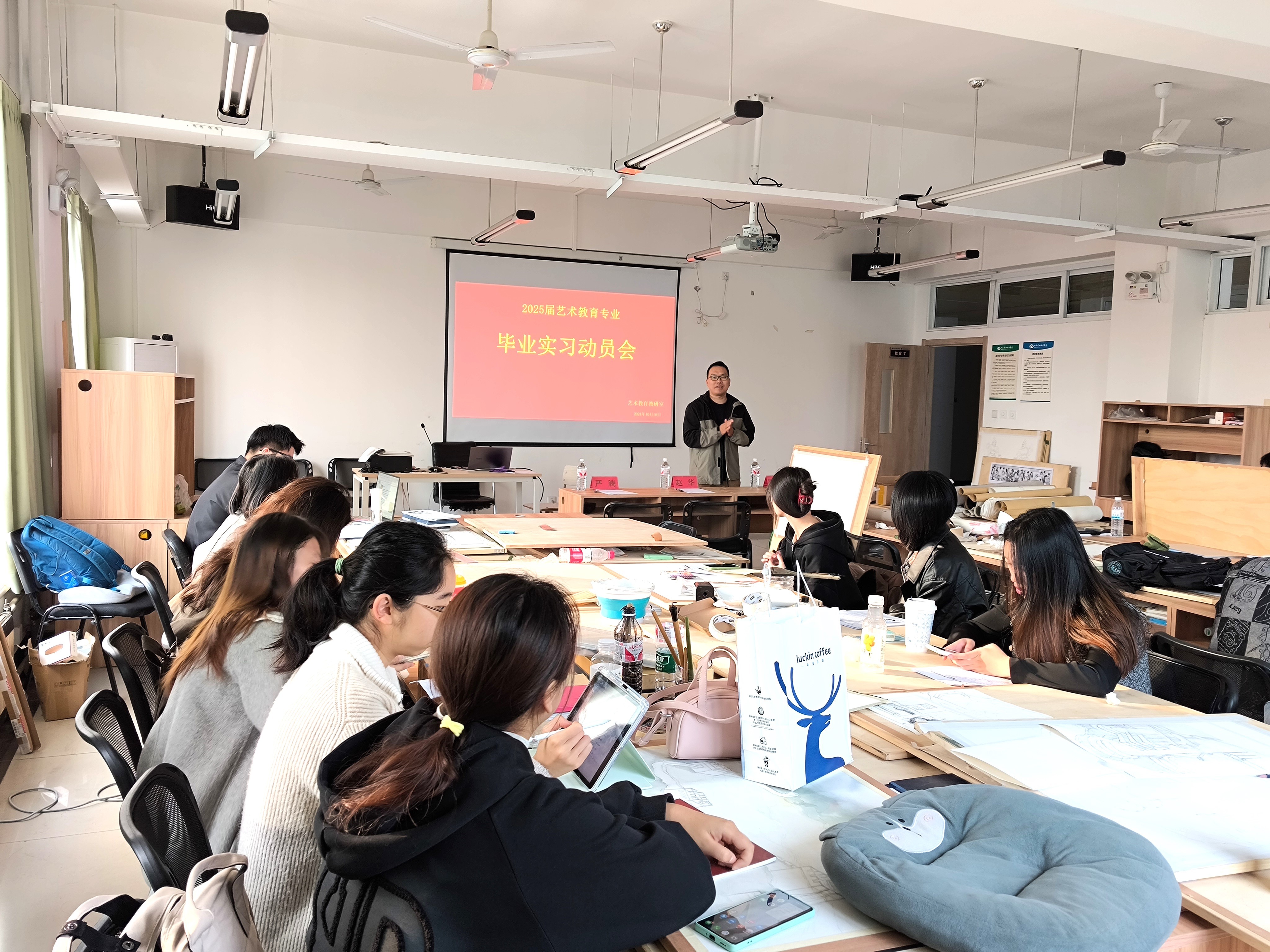 周劲志老师向艺术教育专业学生详细介绍了毕业实习工作的整体安排,涵盖实习时间、实习内容、实习单位等多个方面,强调毕业实习是毕业生顺利毕业的重要环节,学生要高度重视,遵守各项制度,坚守安全底线。希望学生们在实习过程能够与人为善,与人为师,与人为友,正确处理与实习学校学生、实习指导老师、实习同伴之间的关系。并提出学生们要以本次毕业实习为契机,在实践中寻找课题,为毕业论文写作奠定基础。