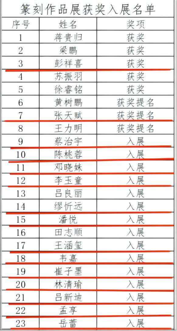 近日,“庆祝北海市海门印社成立十四周年”篆刻作品线上展览评选结果公布,在此次比赛中,我校书法学院教师李鑫、熊东作为特邀作者参加,书法学院教师张天赋获得获奖提名,学生彭祥喜获奖,同时蔡治宇、陈桃蓉、邓晓妹等13名学生入展。