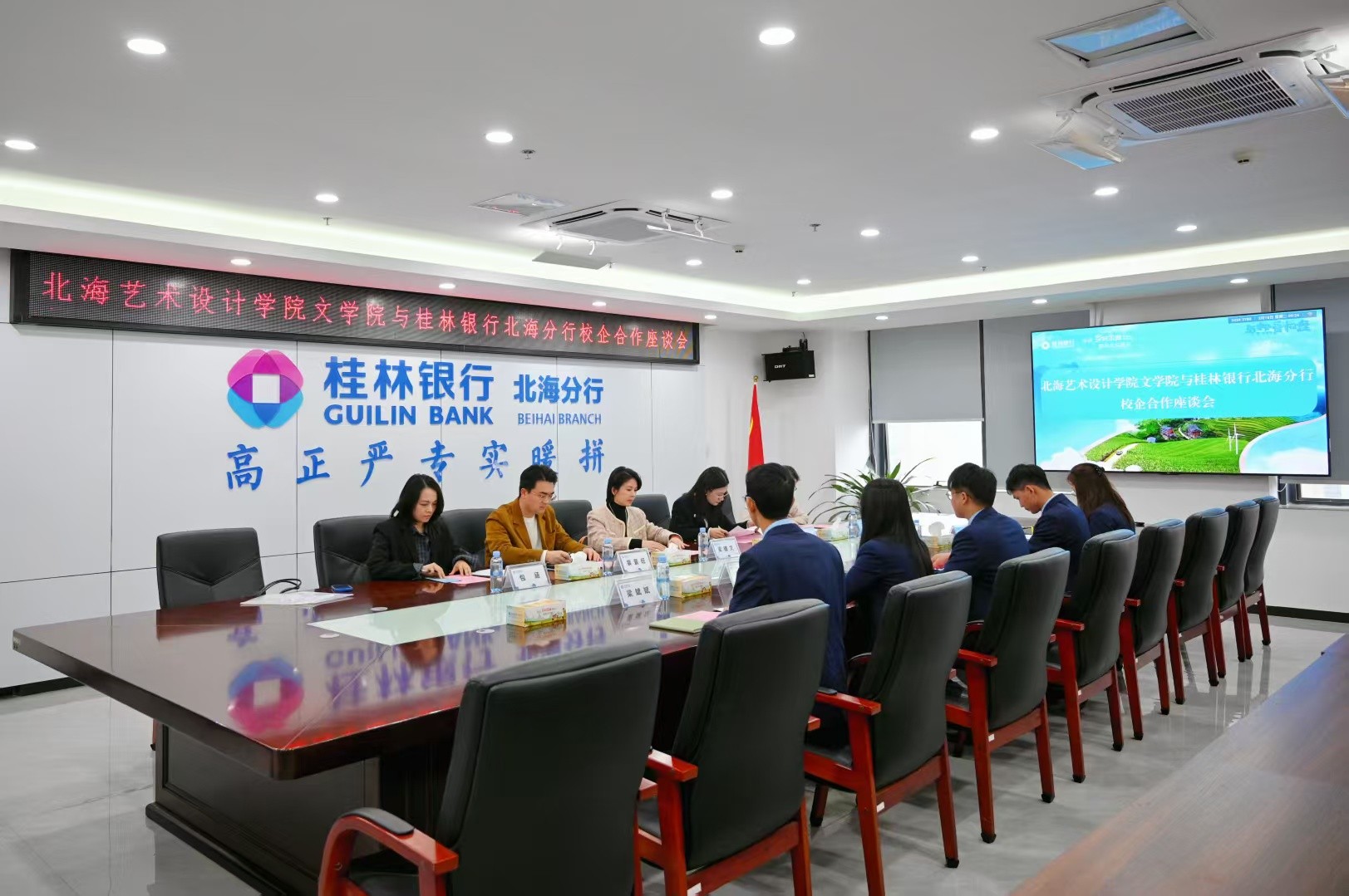 会前,我院一行由桂林银行北海分行人力资源部总经理杨季桦带领参观了桂林银行展厅,通过“实地看、现场学、互动谈”三步走模式,为后续合作奠定坚实基础。交流中,梁副院长讲到,在当今社会,高校与企业的合作日益紧密,这不仅是教育与经济协同发展的重要途径,也是培养适应社会需求人才的关键举措,希望能建立长期稳定的合作关系,通过资源共享、优势互补,实现双方在人才培养、科研合作、社会服务等多个领域的互利共赢,共同为地方经济社会发展贡献力量。通过此次走访,进一步了解桂林银行的用人标准和岗位需求,探索建立更加有效的人才培养和输送机制,为毕业生提供更多优质的就业岗位和职业发展机会,帮助他们顺利走向社会,走上工作岗位。