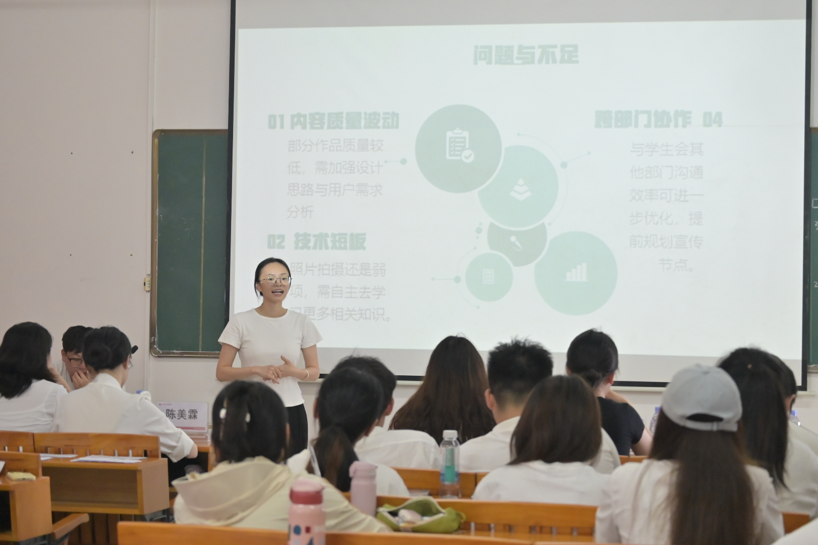 大会第二项议程,团总支各部门负责人总结汇报。团总支主席张佳巾总结了过去一年的工作,涵盖思想引领、组织建设和校园活动等方面,同时指出不足并提出期望。组织部汇报了团员发展和关系转出等工作内容;宣传部展示了邀请函和创意海报等成果;文体部分享了新闻稿撰写的相关要求和校园运动会等活动;纪检部强调了考勤监督和卫生检查的重要性。各部门总结了成绩与经验,分析了不足,并展望了未来工作。此次汇报使全体学生干部了解了过去一年的工作情况,为换届工作奠定基础,激励大家继续奋进。