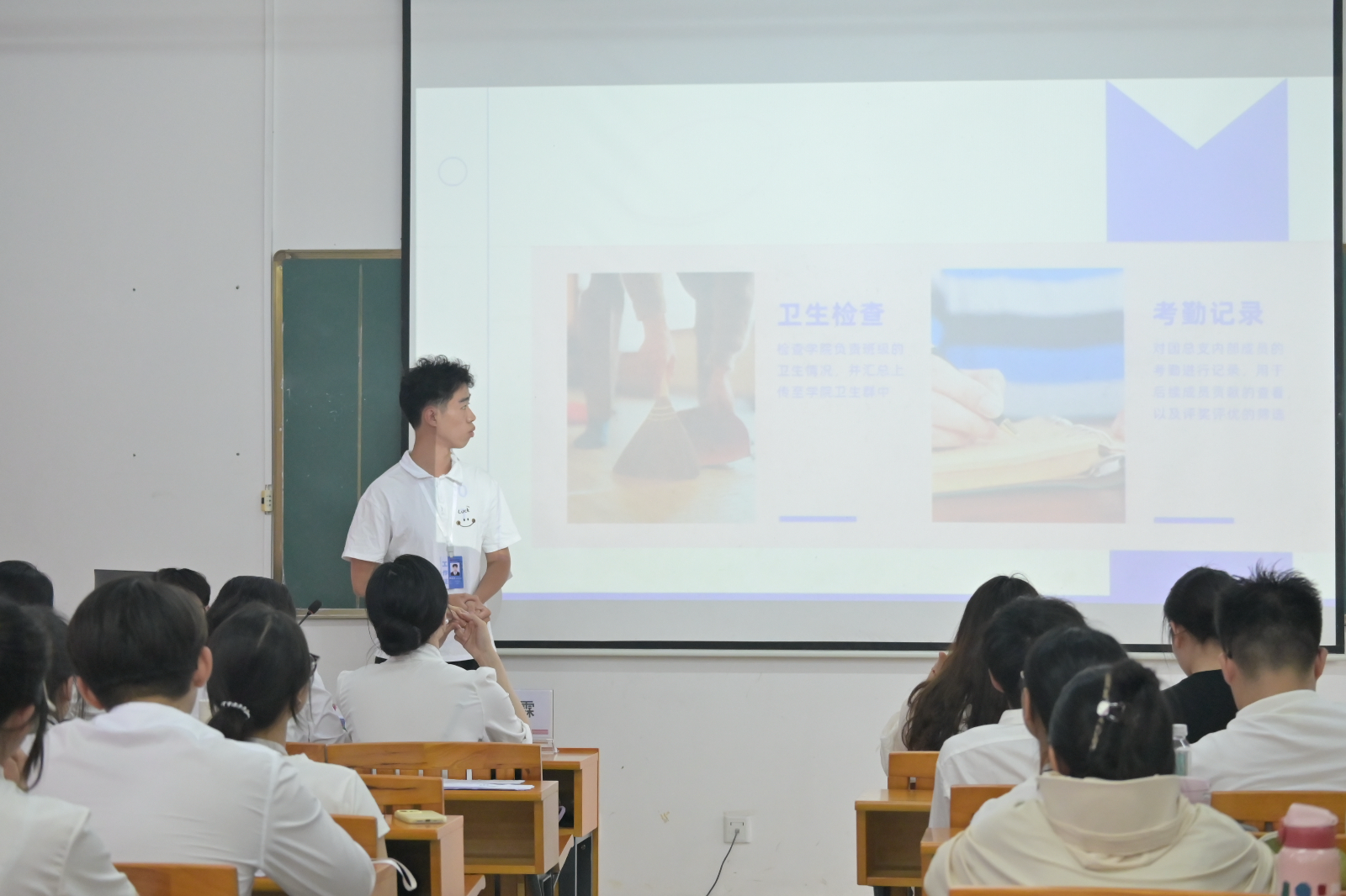 会第项议程是干部竞选演讲。参与竞选的学生干部精神饱满、自信昂扬,依次登台发言。他们基于在团总支的实践经历,阐述了未来的工作规划和展望,结合具体案例分析现存问题并提出创新举措,展现出对工作的深刻理解、强烈的责任感以及勇于担当、积极进取的精神风貌。