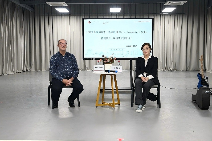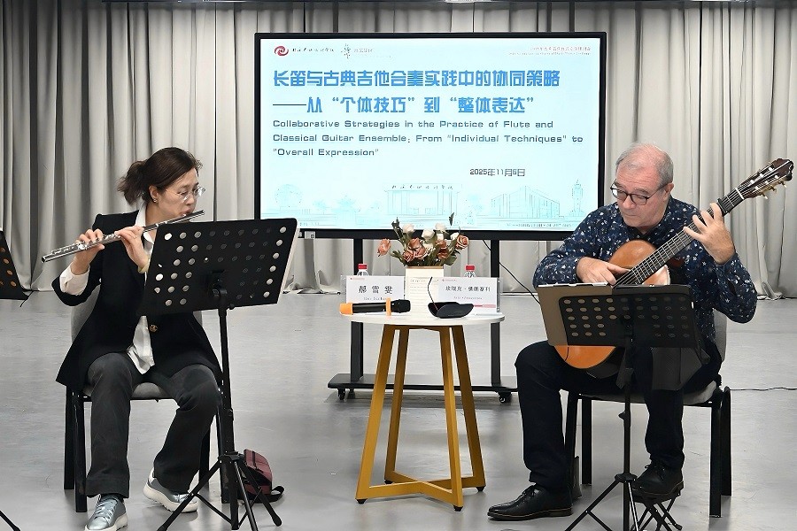 2025年11月5日,法国著名古典吉他演奏家埃瑞克·佛朗塞利与旅法长笛演奏家郝雪雯女士莅临北海艺术设计学院,以“长笛与吉他合奏实践中的协同策略——从个体技巧到整体表达”为主题,为师生带来了一场兼具专业深度与艺术魅力的交流研讨
