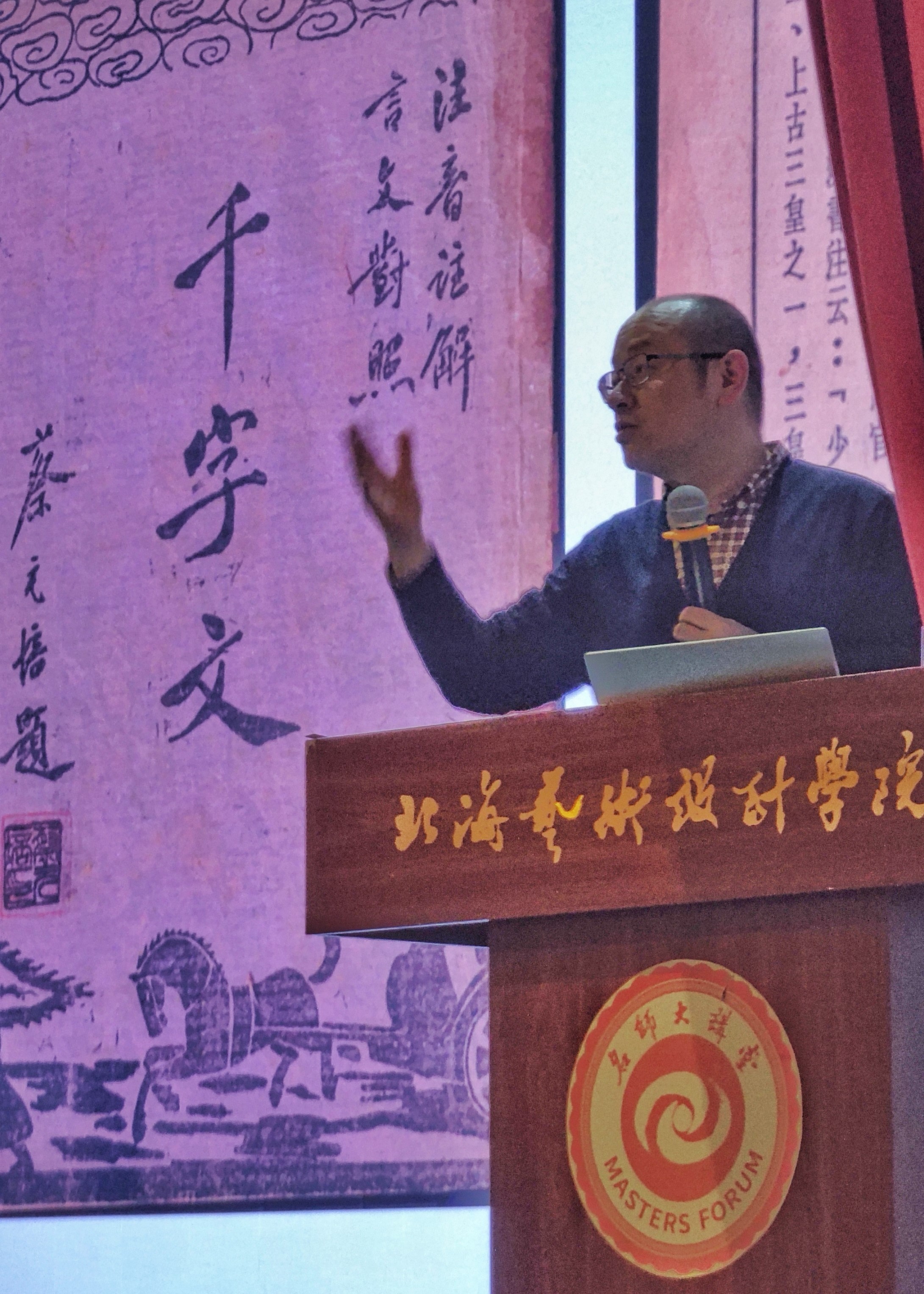 2023年2月18日晚7:30,中央美术学院周博教授于北海艺术设计学院西校区大礼堂,为美术学院师生开展题为《目击而道存:<千字文>传统与汉字字体系谱》的专题讲座。