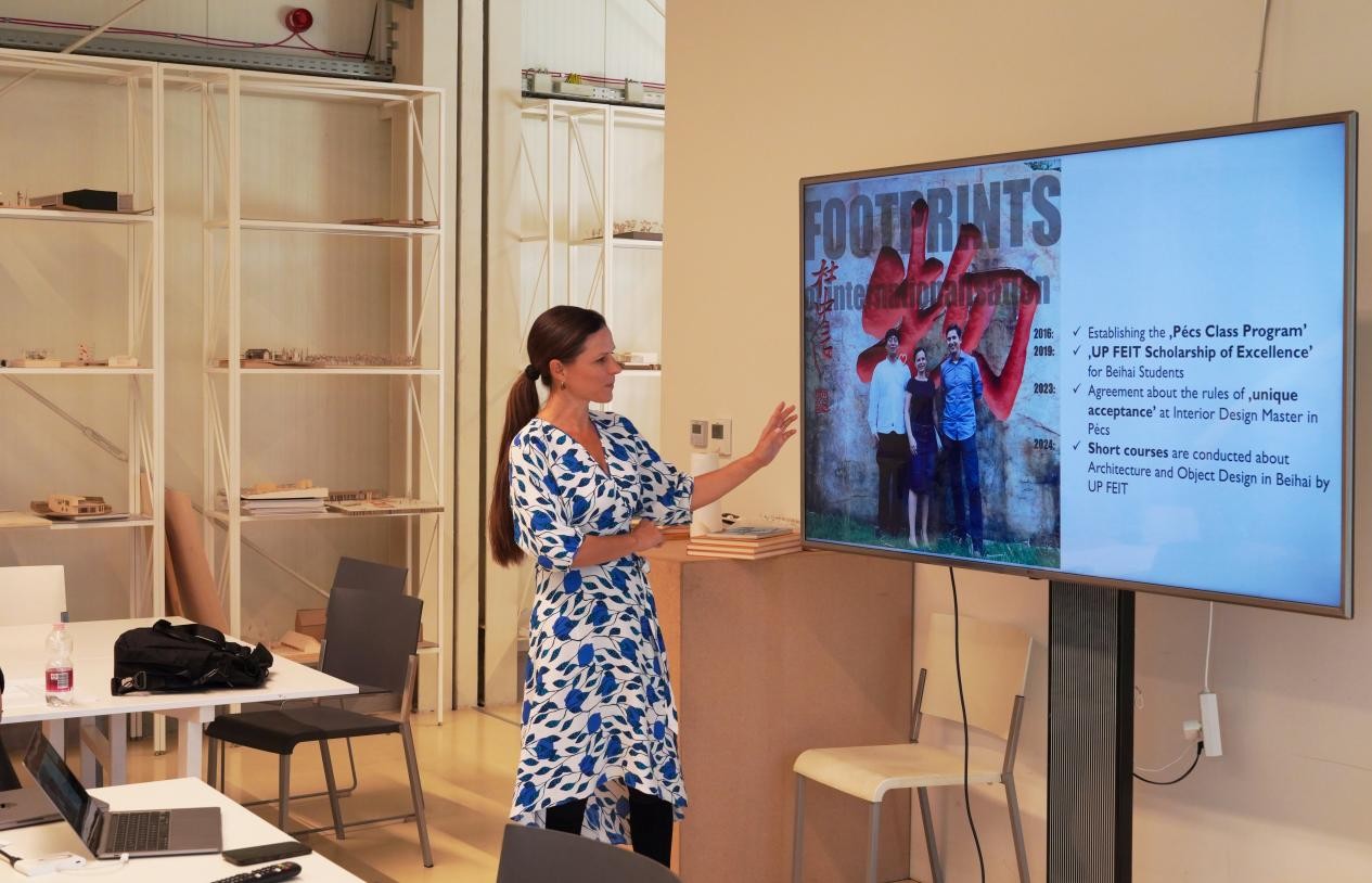在国际教育方法交流过程中,博士院院长Prof Bálint Bachmann首先向我校代表团的老师们深入介绍了学院在国际研究生教育发展、典型设计案例研究中艺术与工艺结合等方面的相关内容。另外,建筑学院视觉研究系教授、室内设计系应用与创意设计教师及学院在校研究生从学院的专业教学、培养模式及项目实践落地等多个层面进行了详尽阐述,并与北海艺术设计学院代表团进行了深入的交流。期间,汉文化传播产业学院院长陈婷婷代表学校参加了国际研究生论坛,并做了主题演讲。