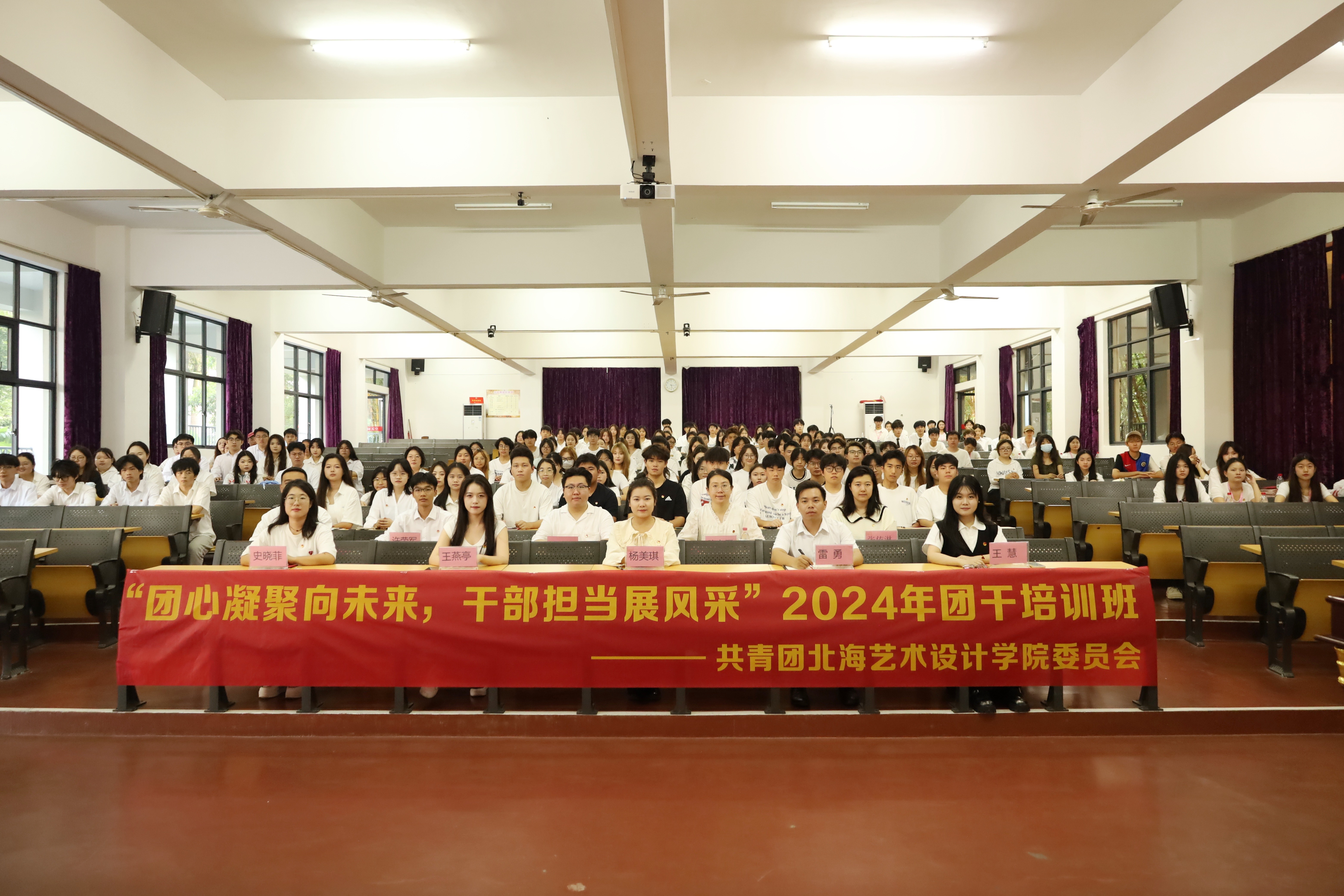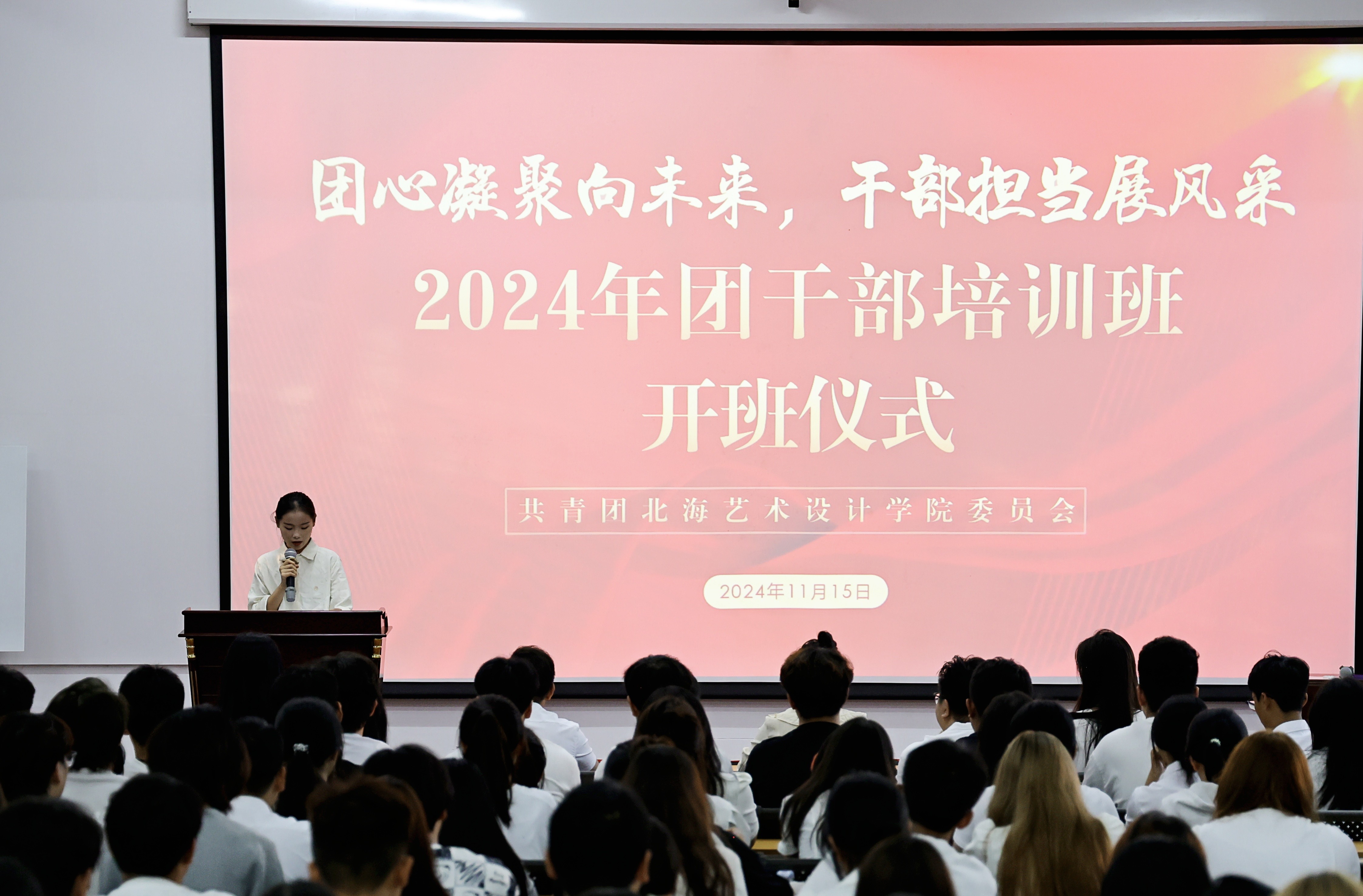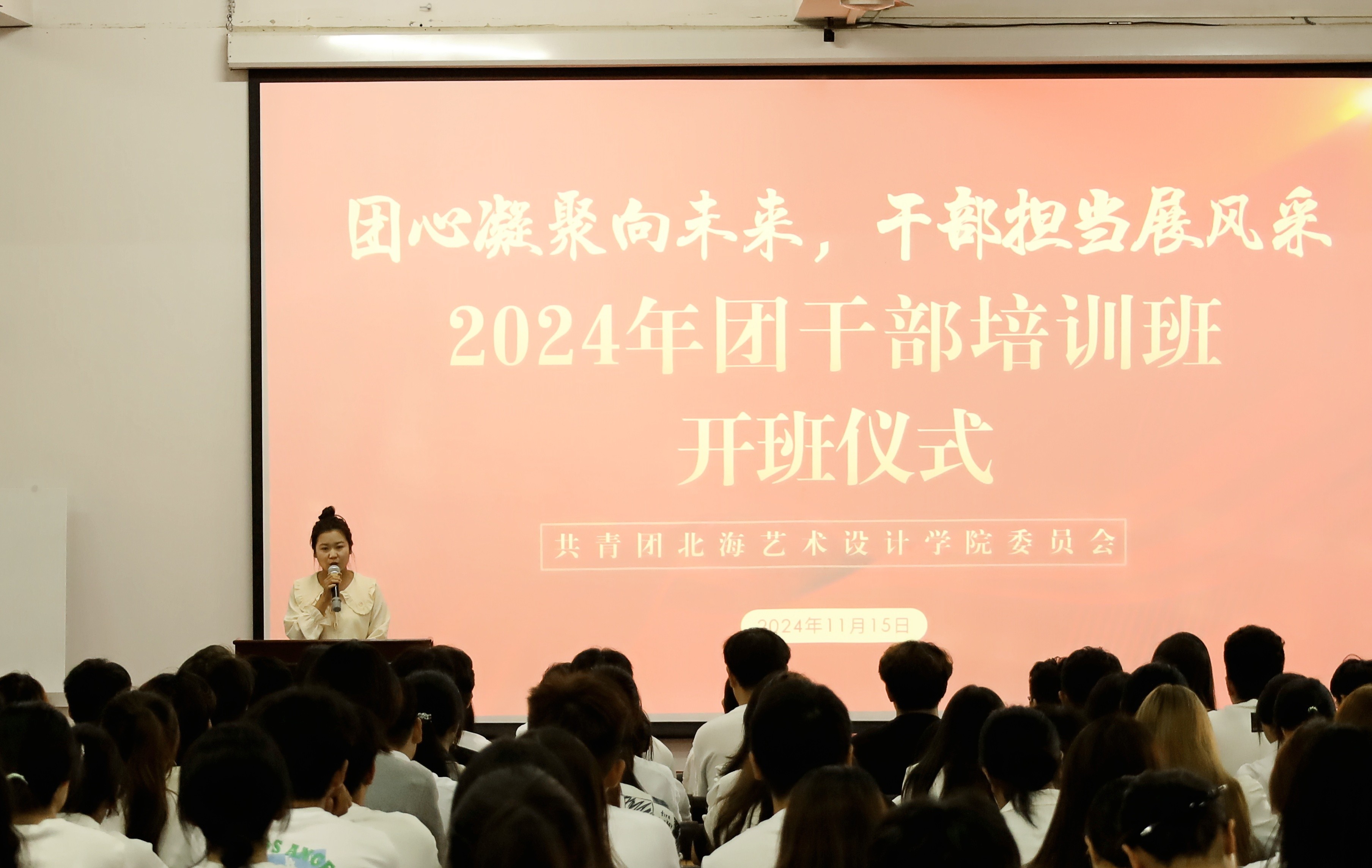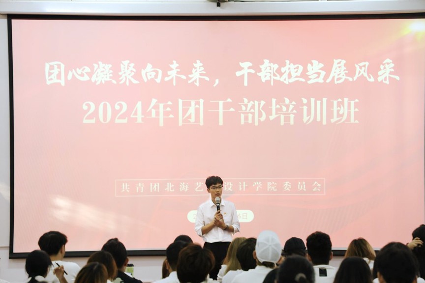 为学习贯彻党的二十大精神,明确本校共青团员干部责任与担当,20241115日至16日,由共青团北海艺术设计学院委员会主办,舞蹈学院分团委、美术学院分团委承办的“团心凝聚向未来,干部担当展风采”24级团干培训班在西区伦理楼107顺利开展。此次会议到场的领导老师有校团委副书记杨美琪、校团委办公室主任雷勇、校团委组织部部长王燕亭、设计艺术学院分团委书记王慧、舞蹈学院分团委书记史晓菲、美术学院分团委书记许荣军、文学院分团委书记马有泽、建筑与环境艺术学院分团委副书记陈宣辰、动画与传媒学院分团委指导老师张依淋。由王诗涵担任主持人,进行了开班的五项议程。