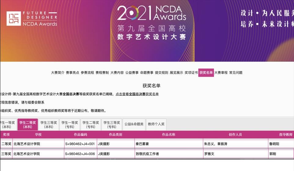 美术学院摄影系与绘画系学生荣获第九届全国高校数字艺术设计大赛(未来设计师NCDA大赛)全国总决赛二等奖1个,三等奖1个。华南赛区一等奖7个,二等奖4个,三等奖6个。除学生组外,林昌华老师《理想生活之梦里、梦外》作品荣获华南赛区教师组二等奖,唐海副教授《丫人甲的MIUI生活》作品荣获华南赛区教师组三等奖。唐海荣获《优秀组织教师》、《优秀指导教师》称号,李炫勋、郭刚、鲁明阳、孔令石、陈越荣获《优秀指导教师》称号,我校荣获广西赛区《优秀组织奖》。